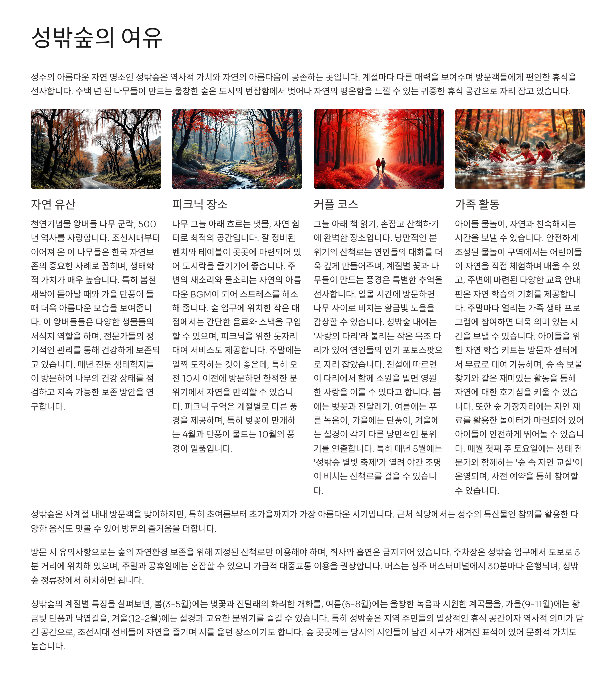 이곳은 단순한 공원이 아니라, 성밖마을 사람들이 조상 대대로 가꾸어온 자연유산으로, 그 자체로도 깊은 정서와 이야기가 깃든 장소입니다. 커플이라면 나무 그늘 아래에서 조용히 책을 읽거나 서로의 손을 잡고 걷는 것으로도 충분히 낭만적인 시간이 됩니다.