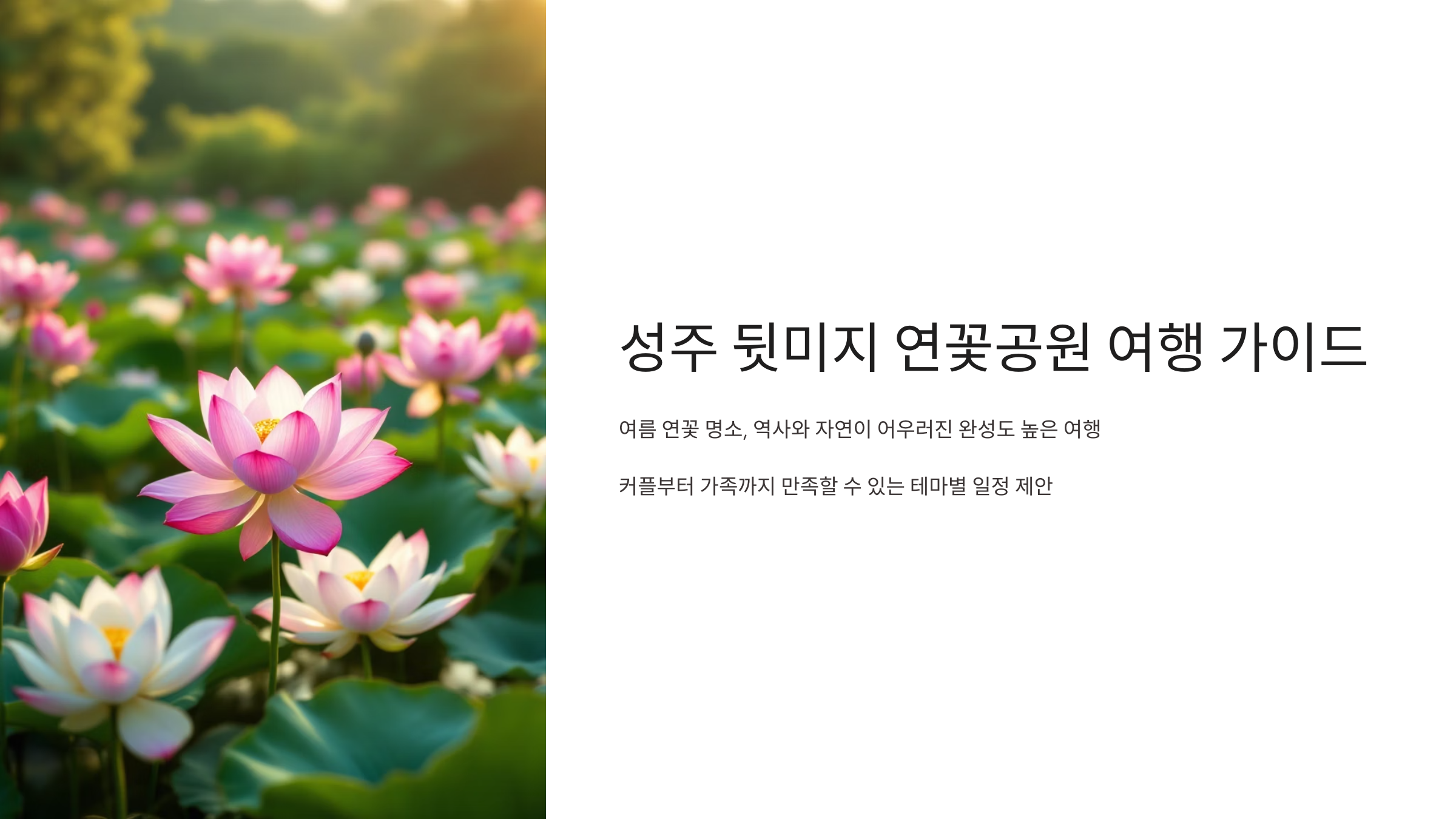 오늘 글에서는 성주 연꽃공원과 함께 방문하면 좋은 인근 관광지들을 테마별로 구성하여, 커플부터 가족 단위 여행자까지 만족할 수 있는 알찬 일정을 제안드립니다.