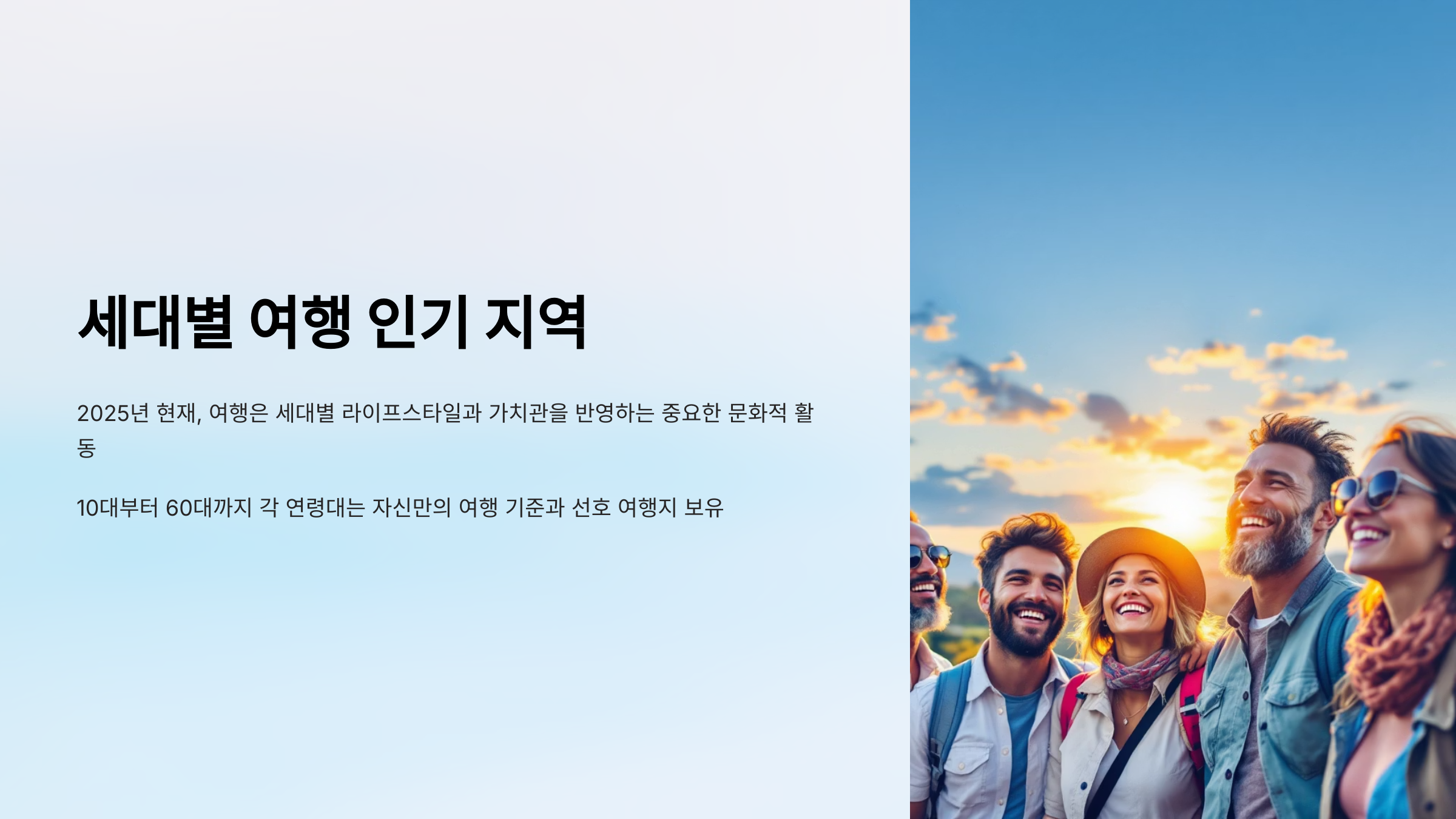 2025년 현재, 여행은 단순한 휴식의 수단을 넘어, 세대별 라이프스타일과 가치관을 반영하는 중요한 문화적 활동이 되었습니다. 특히 10대부터 60대까지 각 연령대는 자신만의 여행 기준을 가지고 있으며, 만족하는 여행지 역시 차이를 보입니다.
