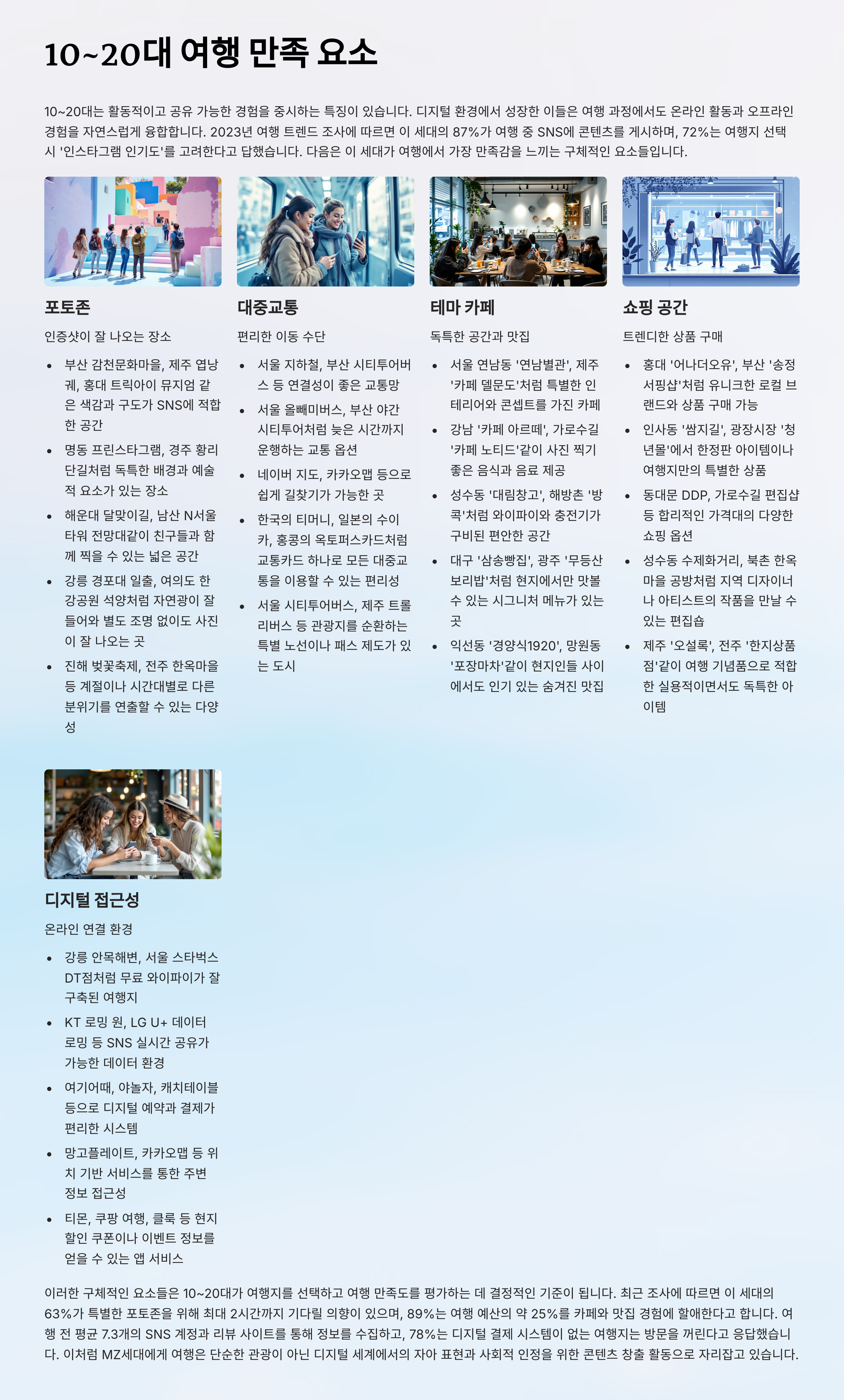 이러한 세대의 만족도를 높이는 요인은 다음과 같습니다: 포토존이 많은 곳, 대중교통이 편리한 도시, 독특한 테마 카페와 맛집, 쇼핑 공간, 문화 예술 요소가 혼합된 거리, 그리고 실시간 SNS 업로드가 가능한 와이파이 환경입니다.