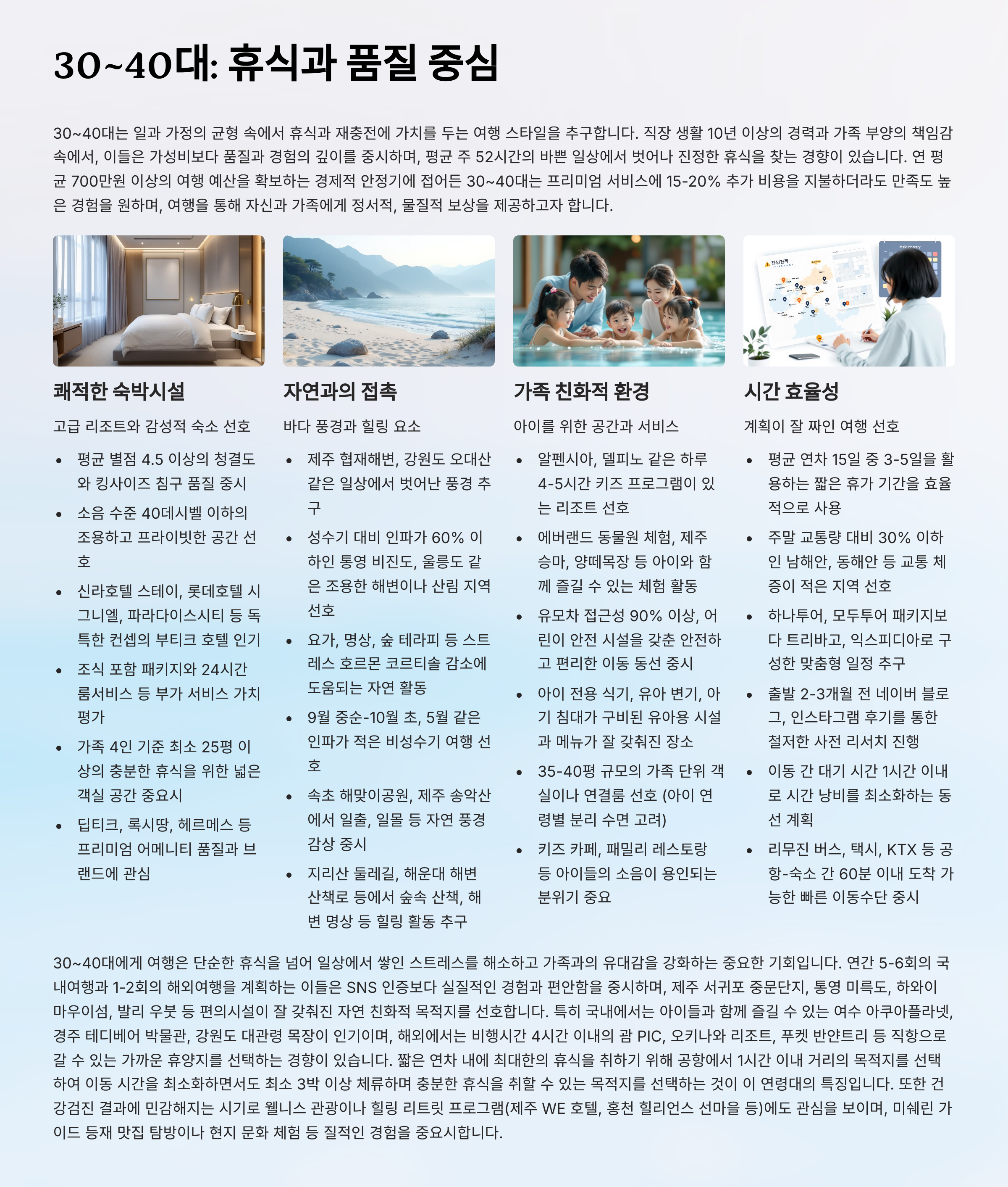30~40대의 여행 만족도를 높이는 핵심 요소는 다음과 같습니다: 쾌적한 숙박시설, 자연과의 접촉, 다양한 식문화, 아이를 위한 공간, 그리고 일상 탈출의 느낌을 줄 수 있는 '비일상성'입니다.