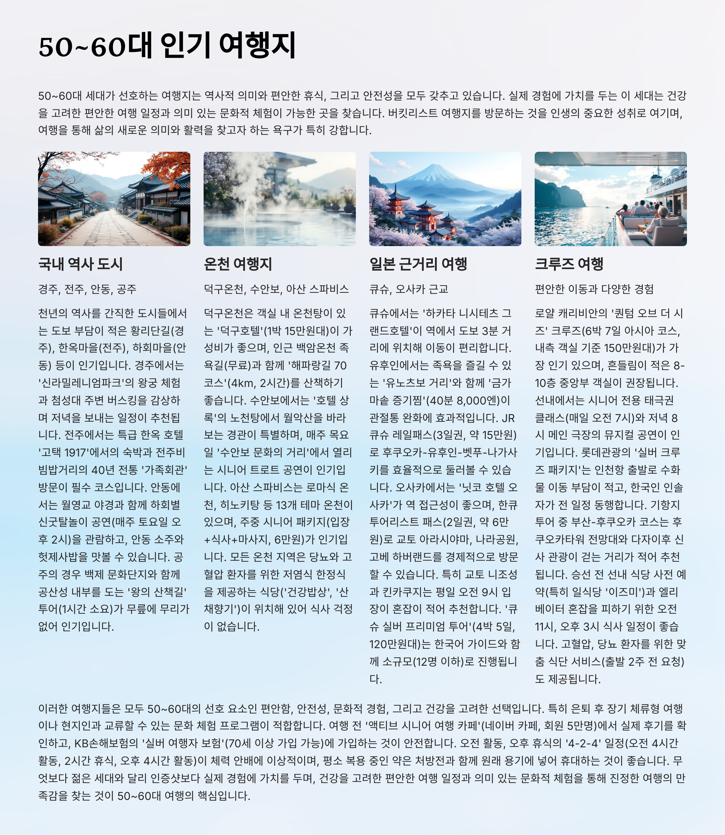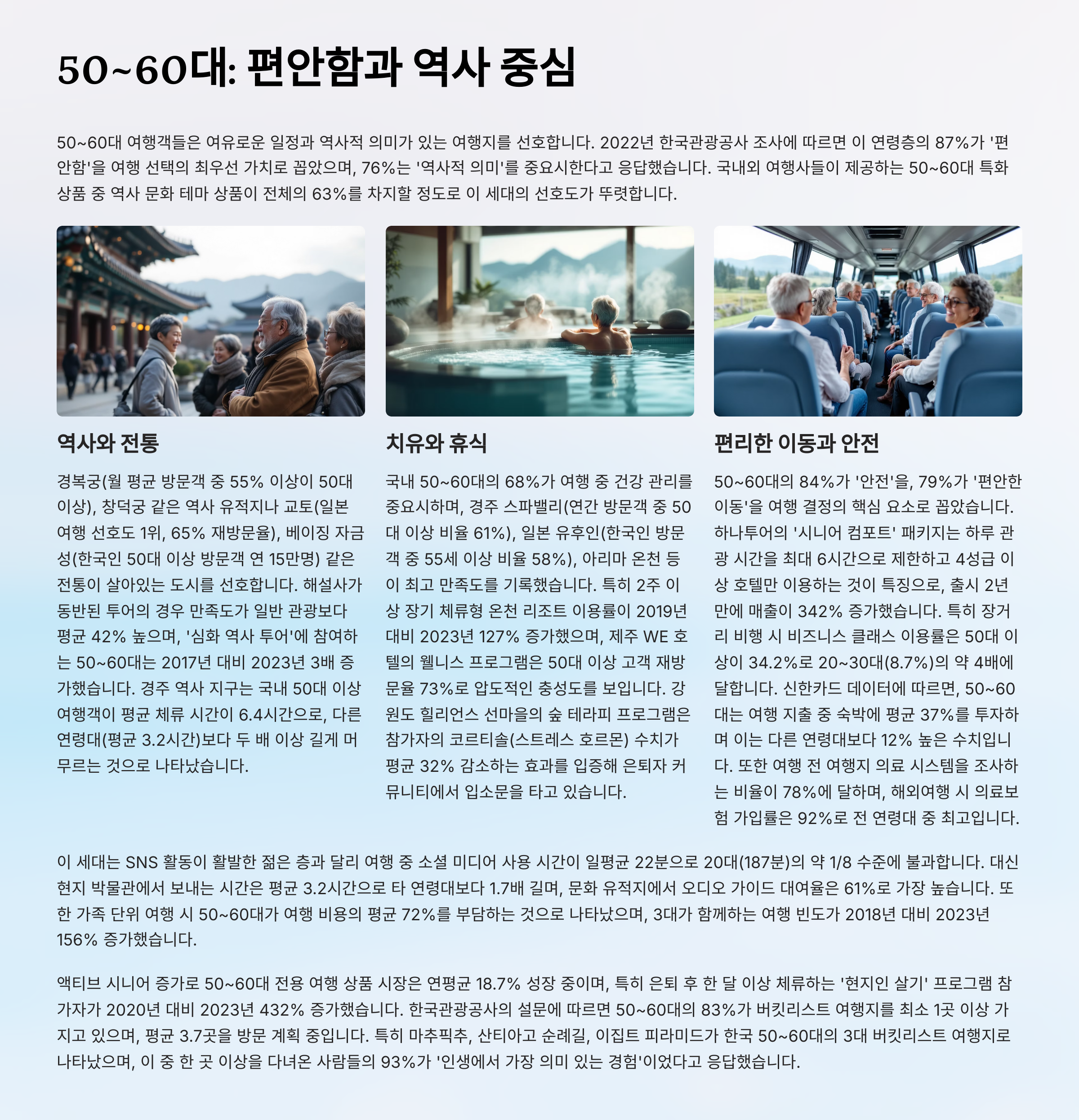 50대 이상은 체력적 부담과 함께, 여행을 ‘치유’와 ‘의미 있는 경험’의 관점에서 바라보는 경향이 높습니다. 이 연령층은 역사와 전통이 살아있는 도시나, 자연과 조화를 이루는 편안한 여행지를 선호하며, 무엇보다 ‘무리가 없는 이동 동선’과 ‘휴식이 가능한 환경’을 중요하게 여깁니다.