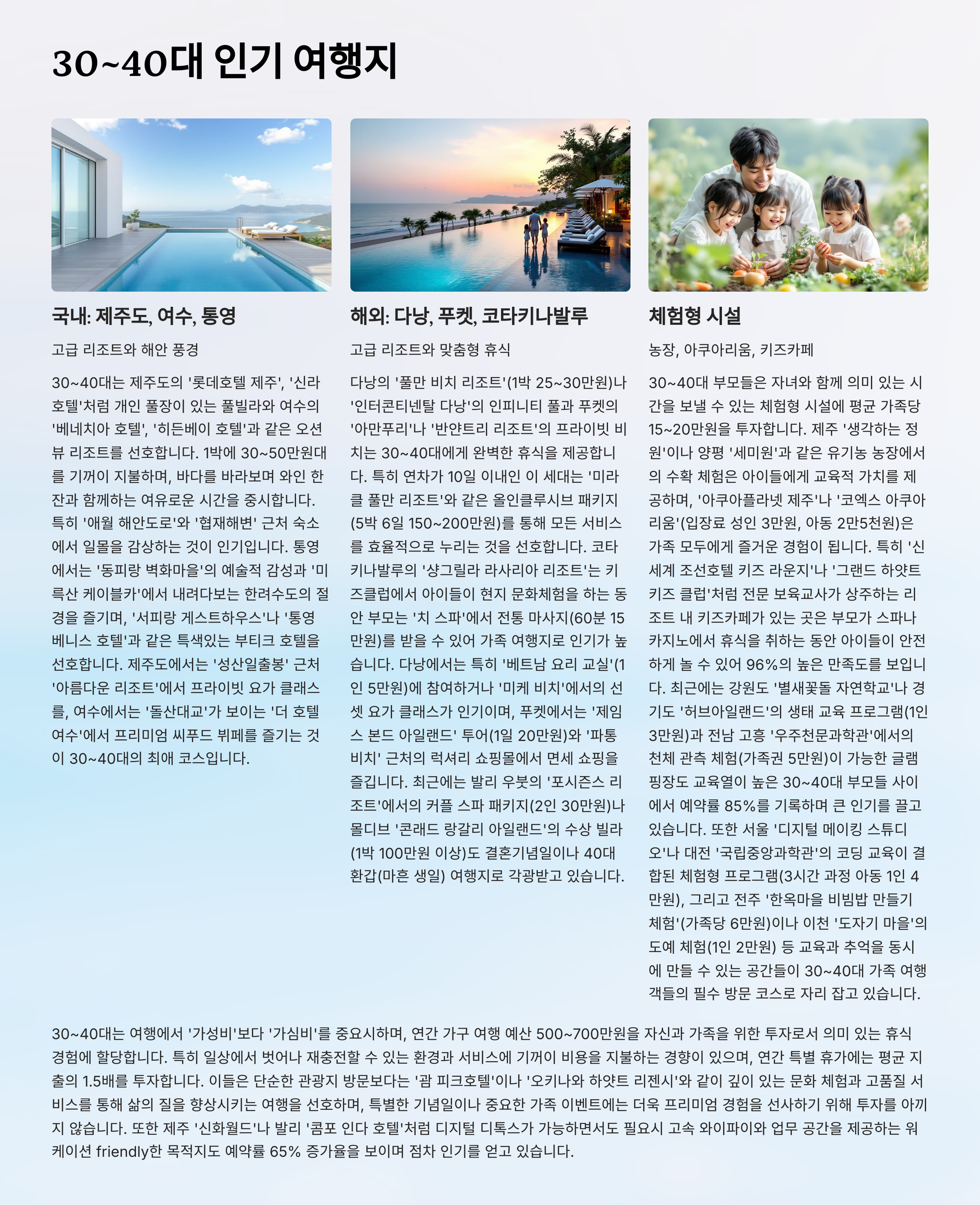 30대와 40대는 인생의 가장 바쁜 시기를 보내는 세대입니다. 직장 생활, 육아, 경제적 책임 등이 교차하는 이 시기에는 여행을 통해 휴식을 추구하는 성향이 강합니다. 이들은 여행의 편안함, 숙소의 품질, 동반자의 편의 등을 종합적으로 고려하여 여행지를 선택합니다.