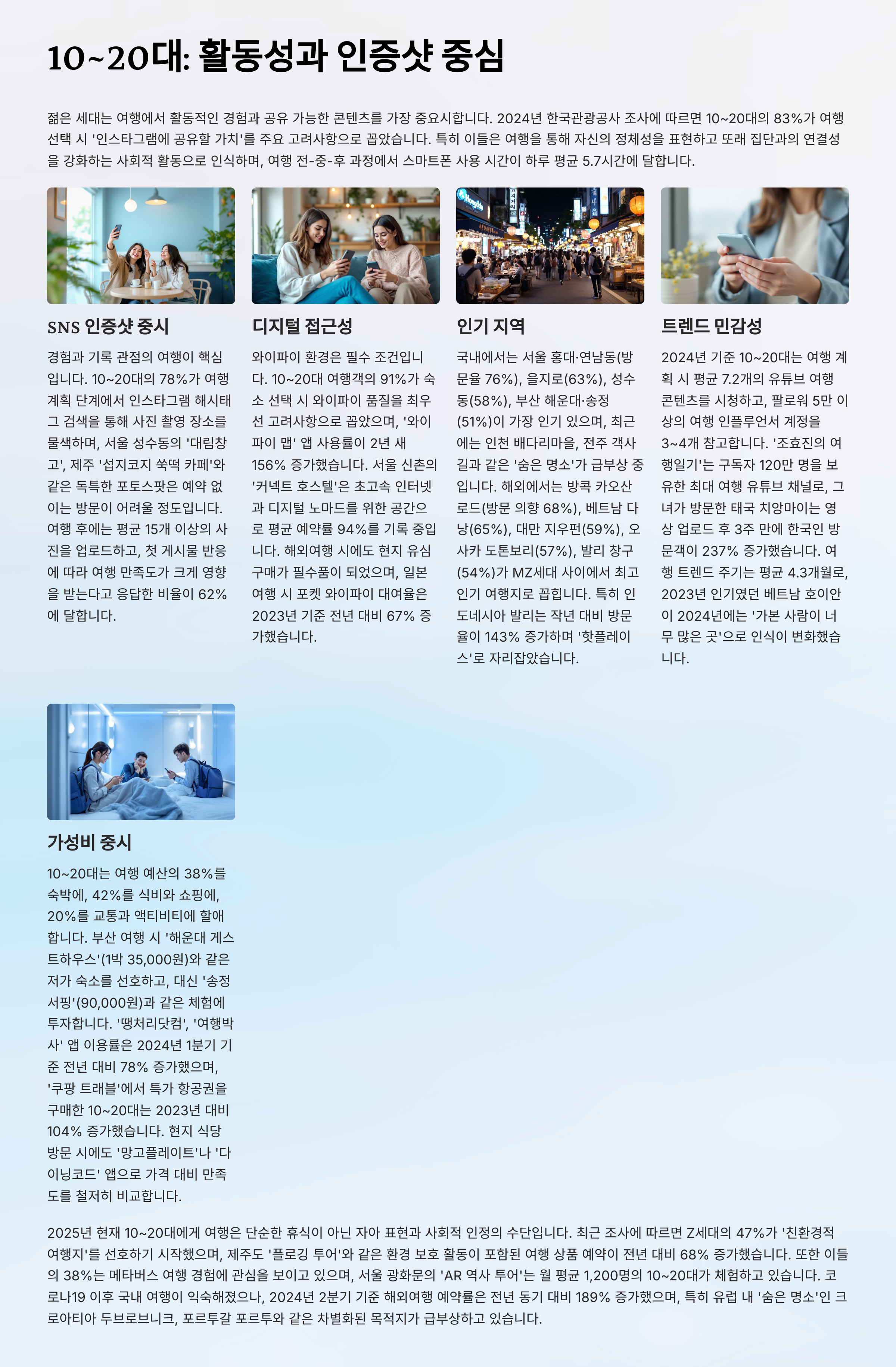 10대 후반부터 20대는 디지털 네이티브 세대로서, 여행을 단순한 휴식보다도 ‘경험’과 ‘기록’의 관점에서 접근합니다. 특히 이 세대는 SNS에 사진을 올리는 것을 여행의 핵심 요소로 생각하며, 인증숏이 잘 나오는 장소에 큰 만족을 느낍니다.