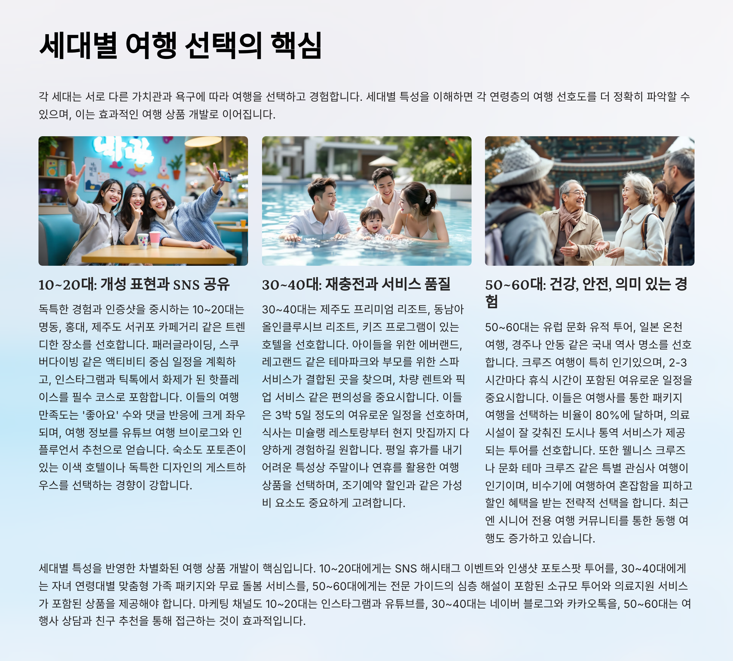 여행 만족도는 단순히 ‘어디를 가는가’보다는 ‘누구와, 어떤 방식으로, 어떤 목적을 가지고 가는가’에 더 큰 영향을 받습니다. 특히 세대별로 중요시하는 기준이 다르기 때문에, 연령대에 맞는 장소와 여행 방식의 선택이 매우 중요합니다.