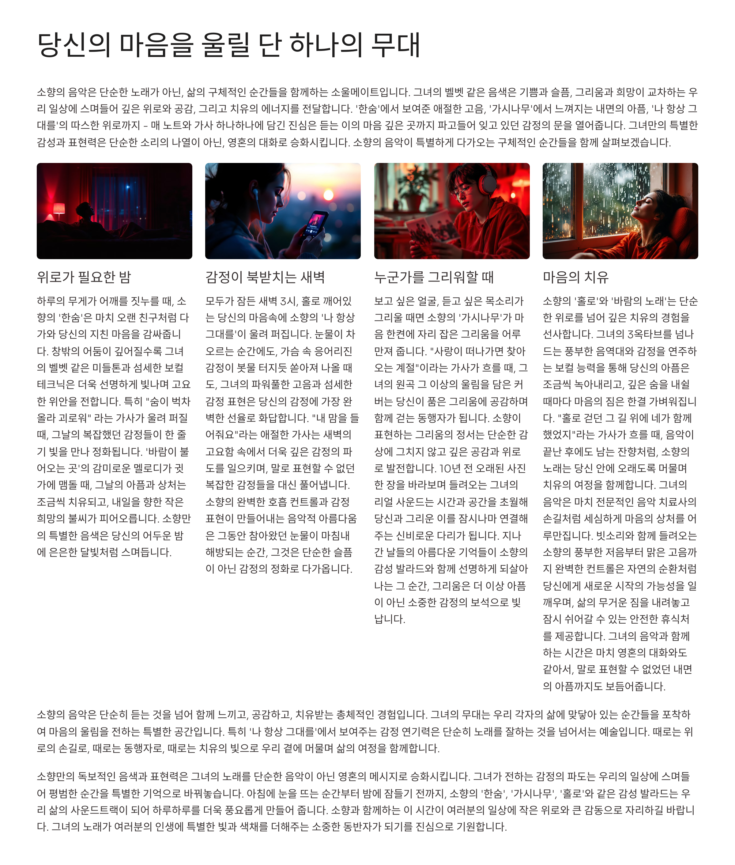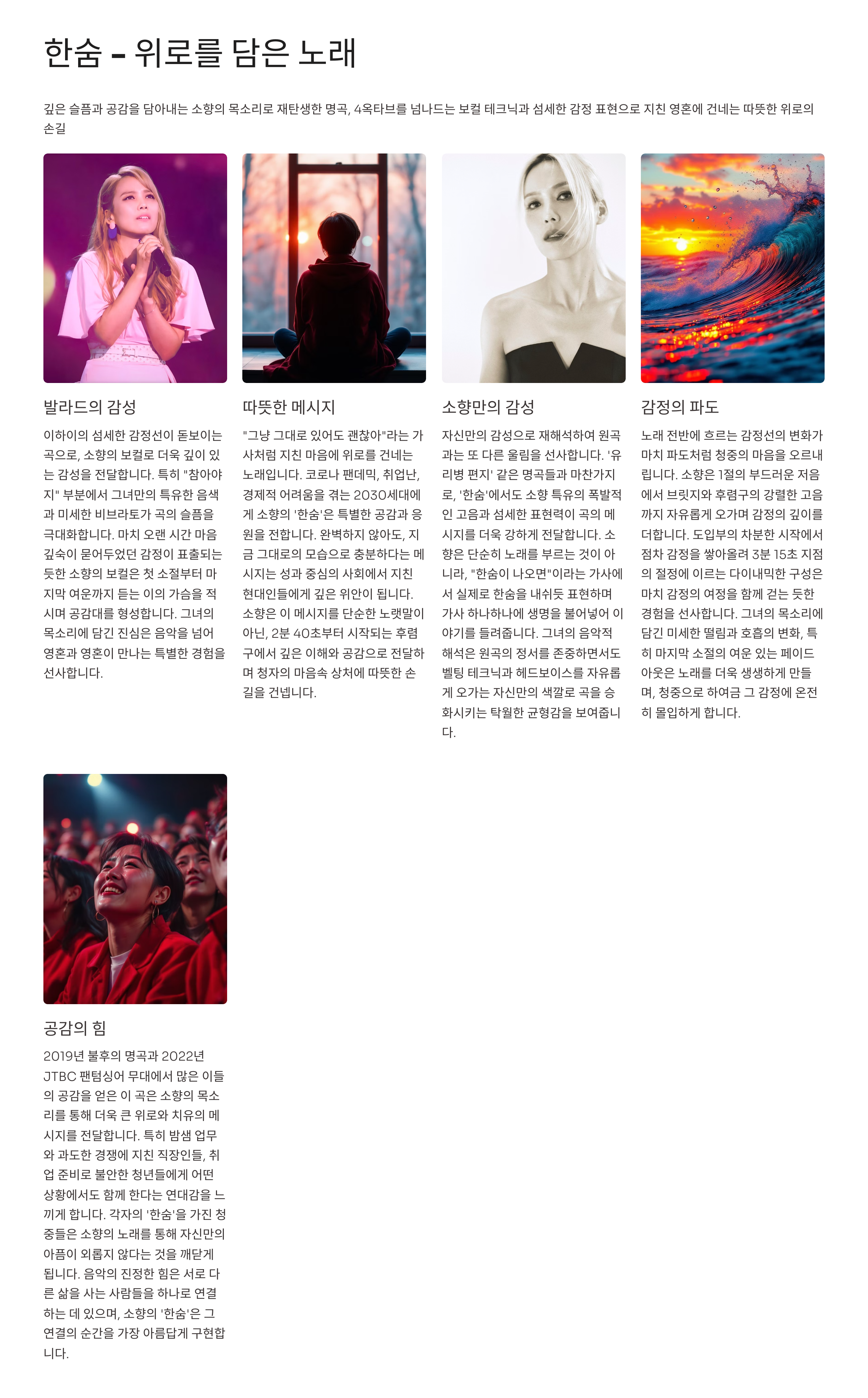 이번에 소개할 영상은 소향이 부른 ‘한숨’ 라이브 무대로, 그녀의 폭발적인 가창력과 섬세한 감정 표현이 만나 듣는 이로 하여금 눈물짓게 합니다.