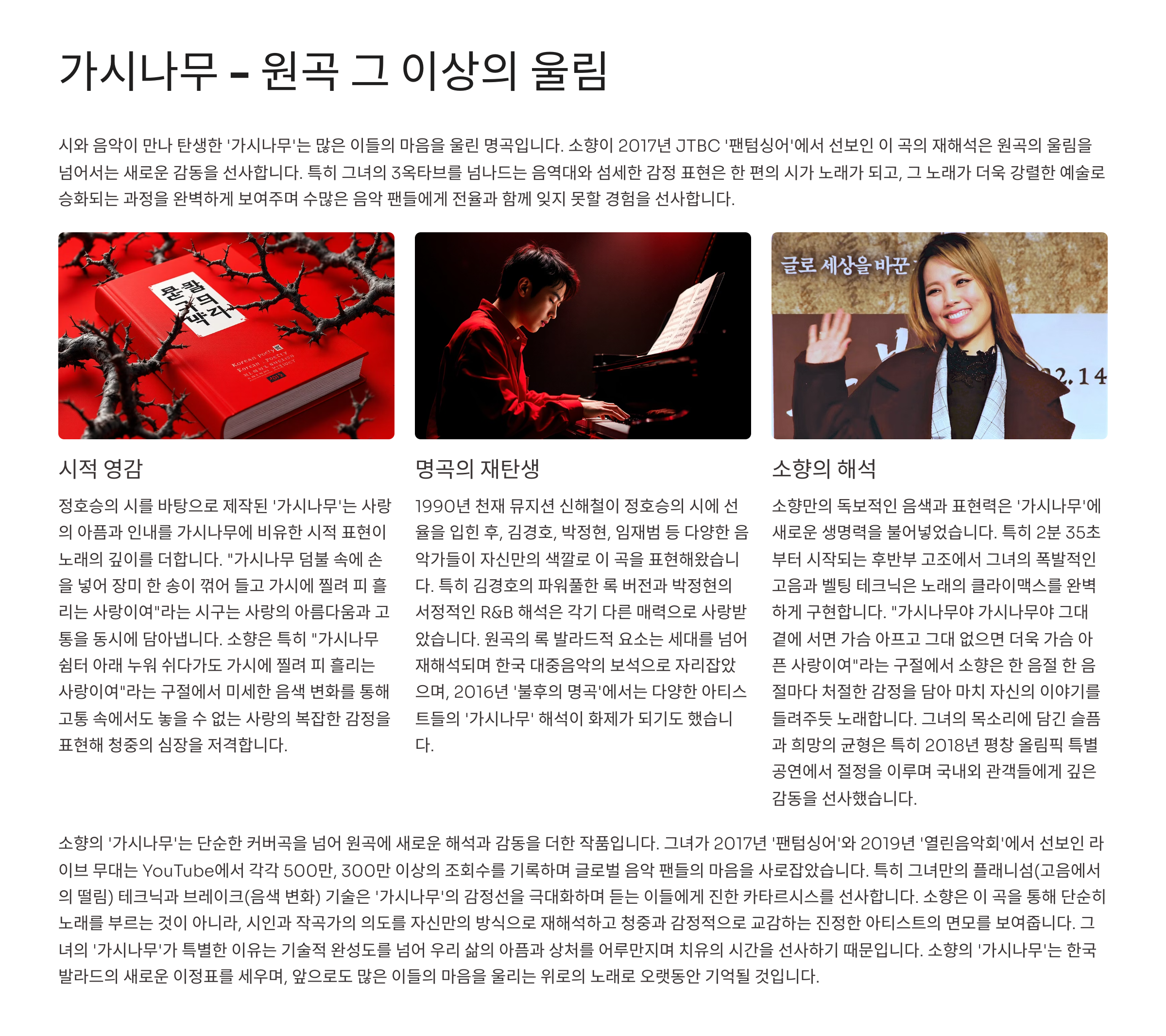 ‘가시나무’라는 노래가 가진 메시지를, 소향은 가장 순수한 방식으로 전하고 있습니다.