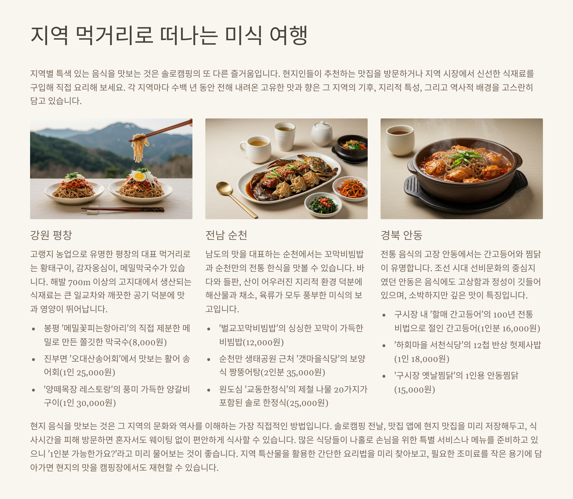 솔로캠핑의 또 다른 재미는 ‘로컬 미식 탐방’입니다. 캠핑장에서만 먹지 말고, 근처 맛집이나 전통시장, 로컬 푸드 트럭을 찾아보세요. 현지에서 나는 신선한 식재료로 요리하거나, 그 지역만의 특색 있는 음식을 포장해 와 텐트 앞에서 즐기는 것도 색다른 경험이 됩니다. 예를 들어 강원도라면 감자옹심이나 막국수, 전라도는 짱뚱어탕이나 남도 백반 등 지역마다 미식 포인트가 다르니 캠핑 전 미리 조사해 가는 걸 추천드려요.