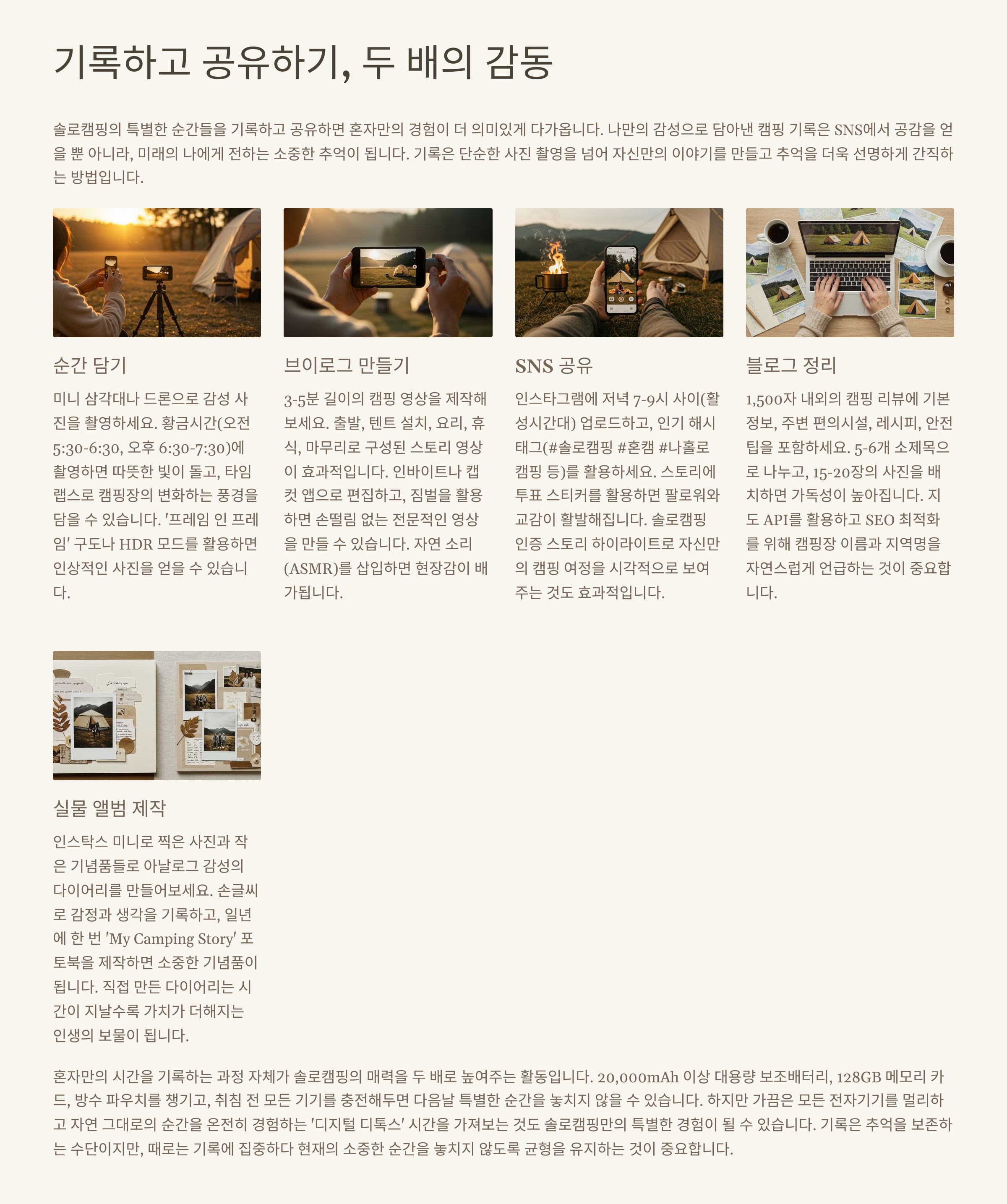혼자 느끼는 감정도 좋지만, 그 순간을 기록하면 시간이 지난 후 더 큰 감동이 돼요. 스마트폰으로 짧은 영상을 찍거나, 감성 블로그나 인스타그램에 짧은 글과 함께 공유해보세요. 요즘은 미니 삼각대나 셀카 드론, 캠핑 전용 포토존 장비도 잘 나와 있어서 누구나 쉽게 감성 콘텐츠를 만들 수 있어요.