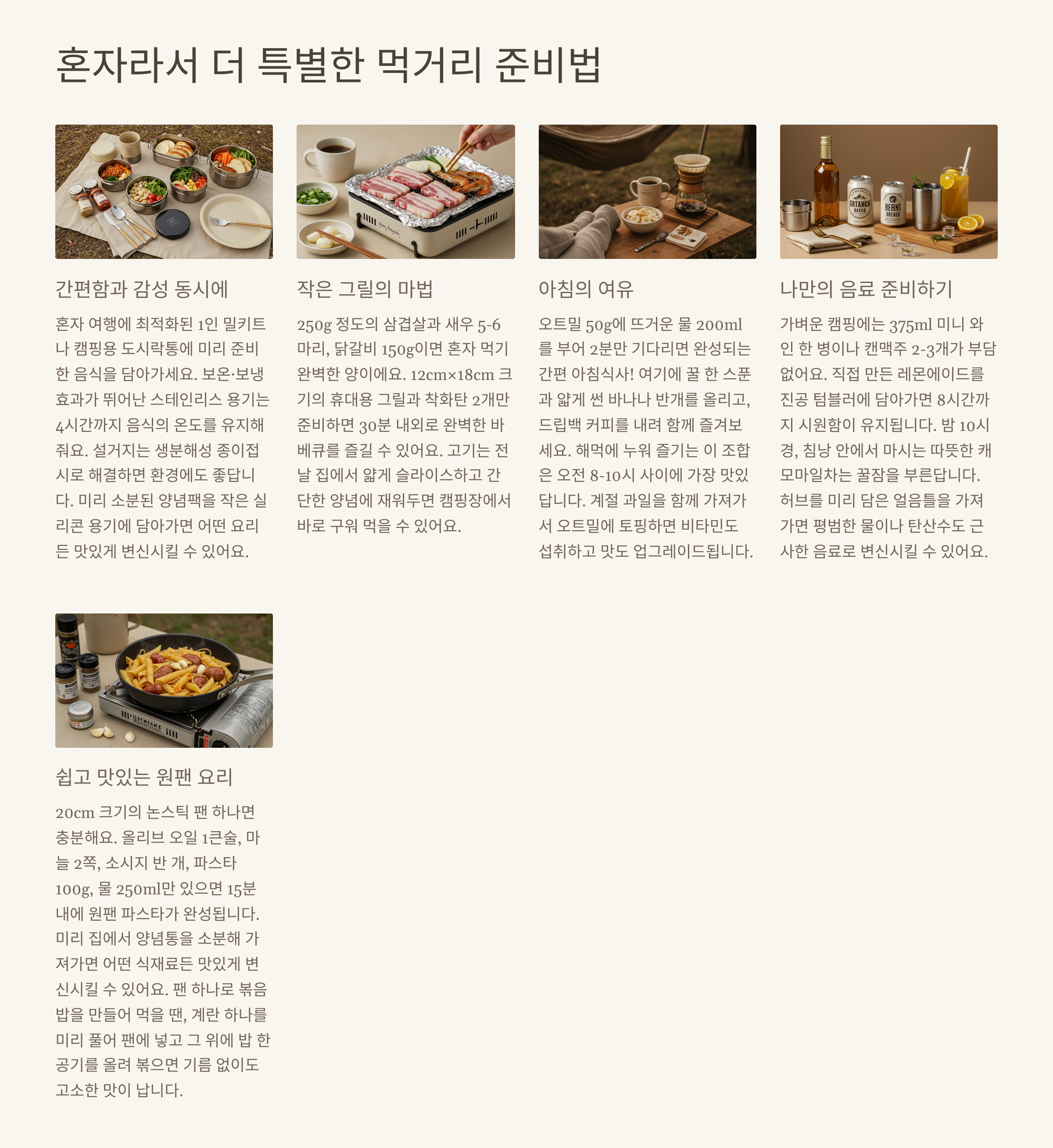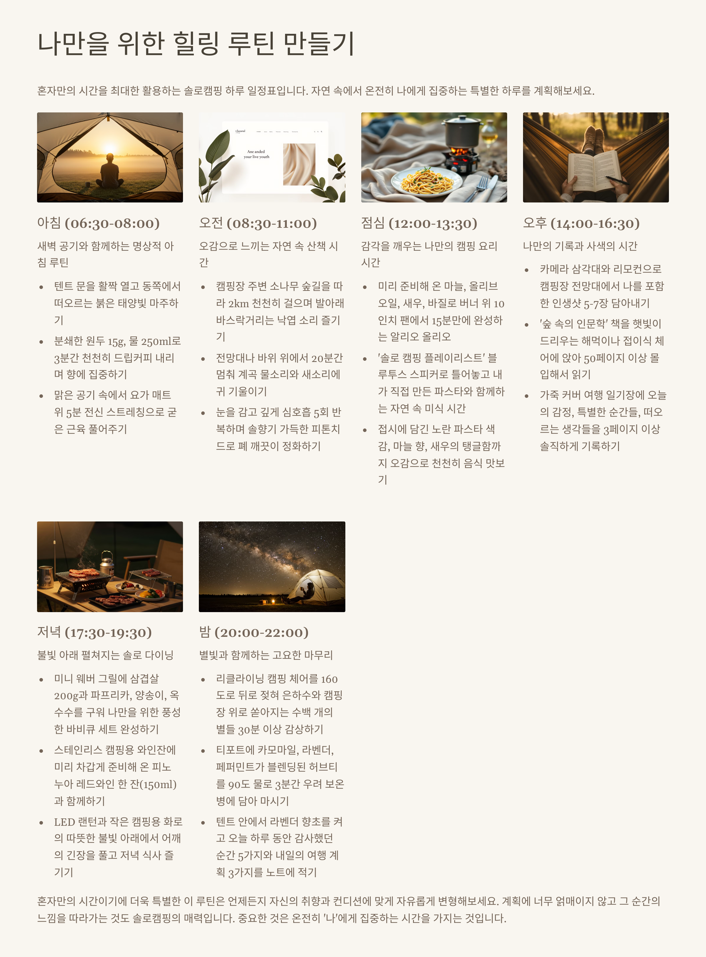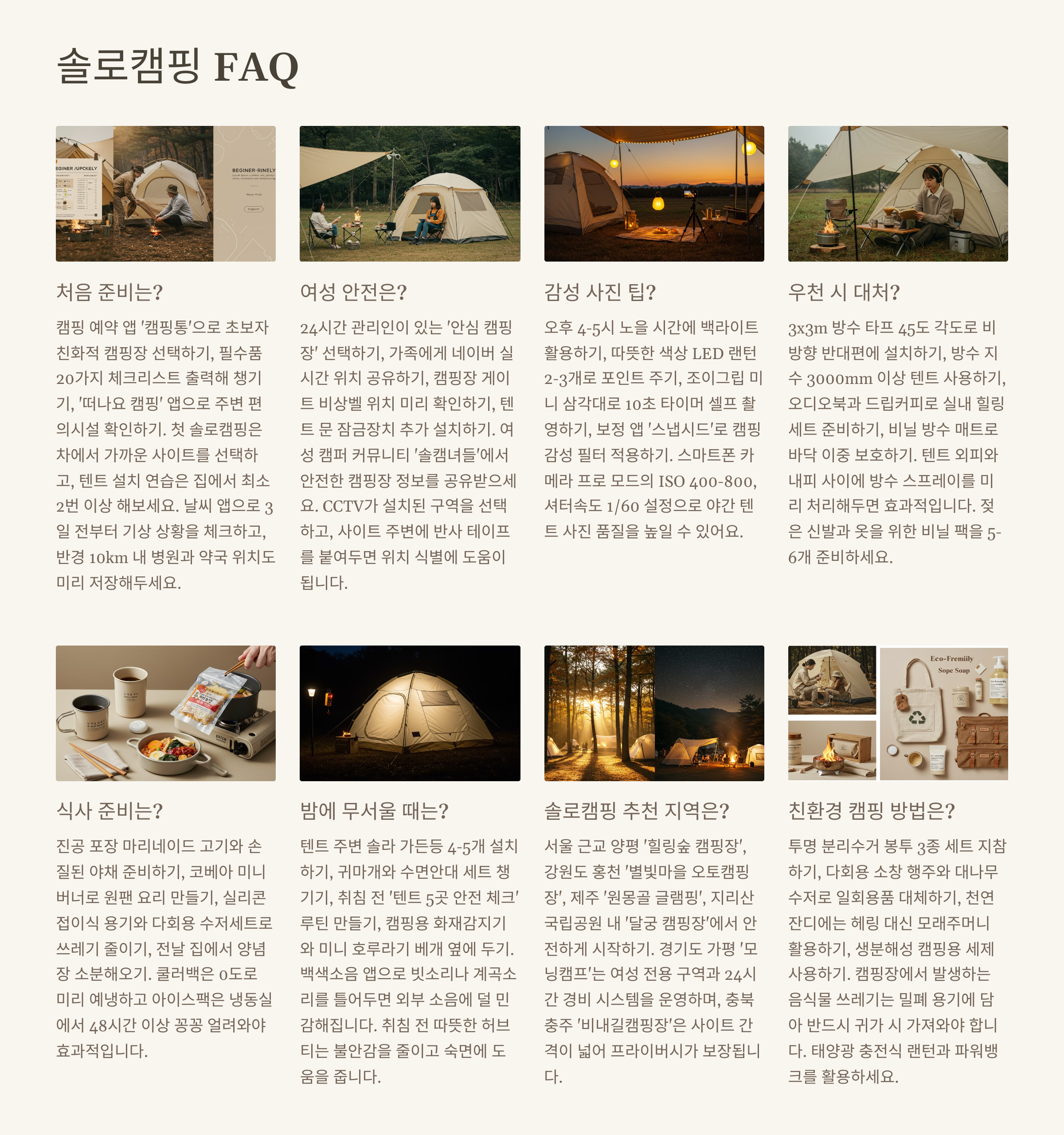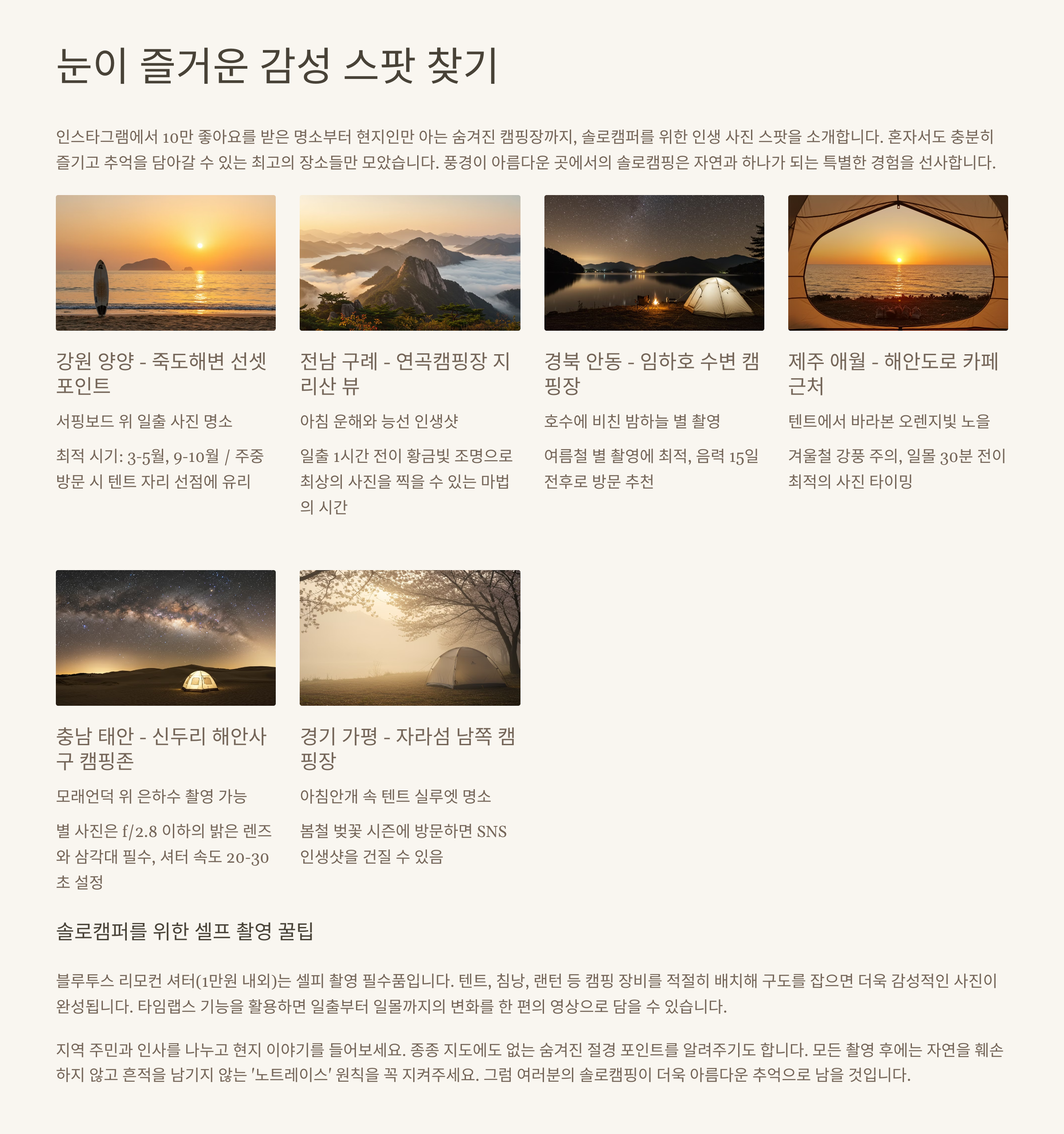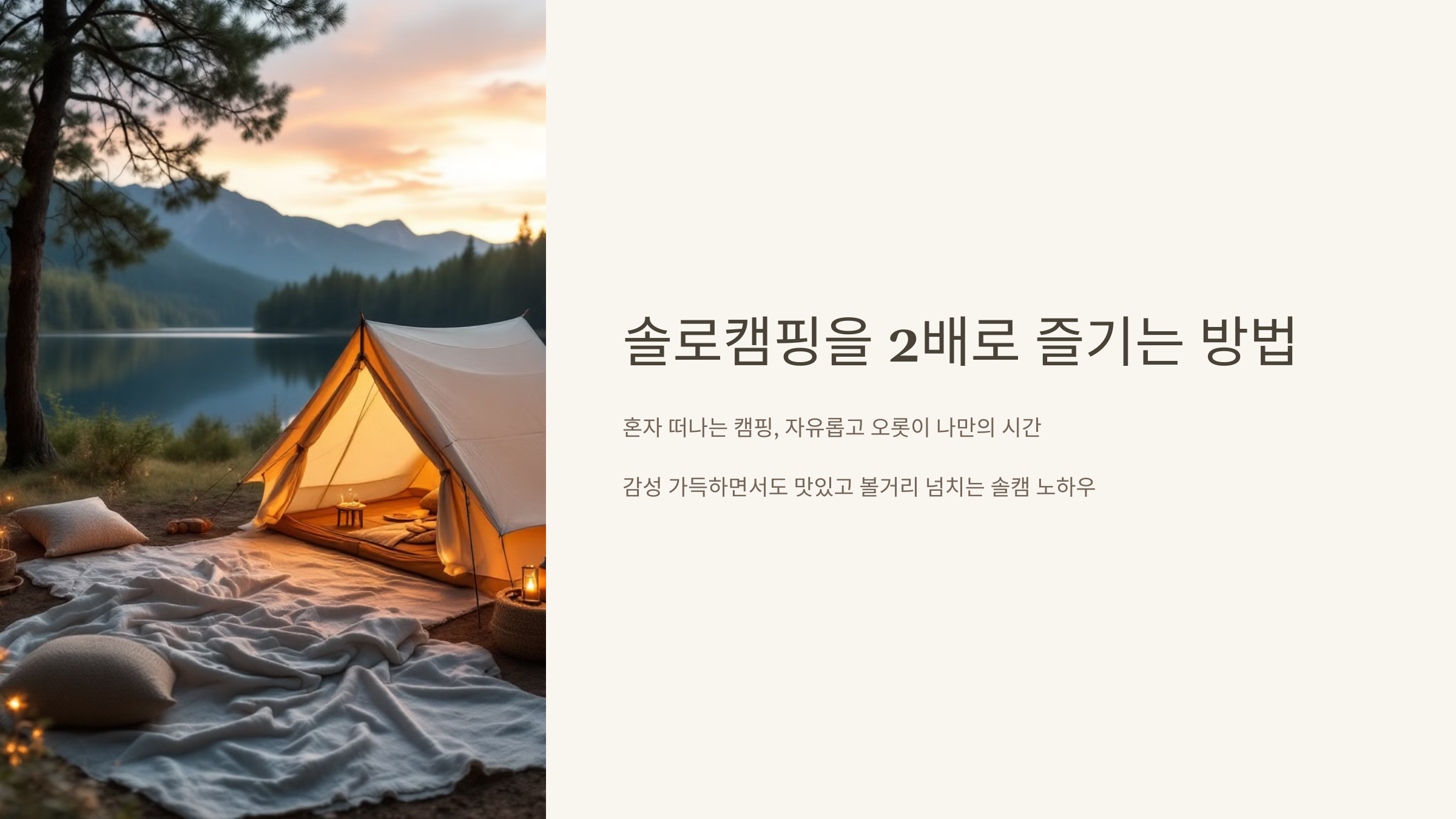 제가 꼼꼼히 조사한 내용을 바탕으로, 여러분의 첫 혹은 다음 솔로캠핑이 훨씬 풍성해지길 바라는 마음으로 준비했어요.