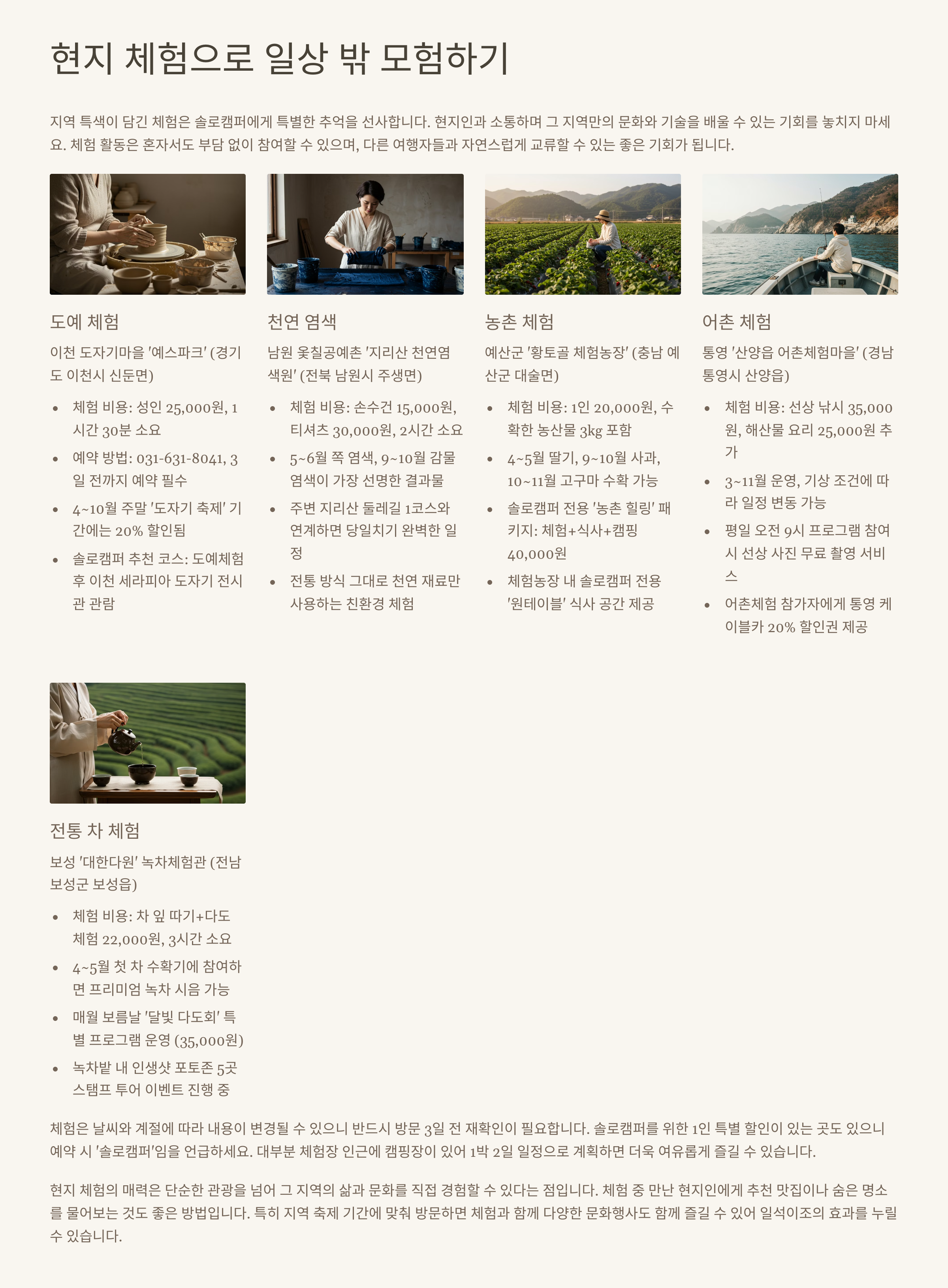 요즘은 캠핑과 연계된 지역 체험 프로그램이 정말 다양합니다. 도예, 나무공예, 농촌 체험, 마을 산책 투어까지 선택의 폭이 넓어요. 이런 프로그램은 지역 관광 홈페이지나 마을 커뮤니티, 또는 해당 캠핑장에서 안내받을 수 있어요. 혼자서 참여해도 조용히 집중할 수 있어서 오히려 힐링되죠. 체험을 통해 얻은 소품이나 경험은 캠핑 이후의 일상에도 특별한 추억으로 남을 거예요.