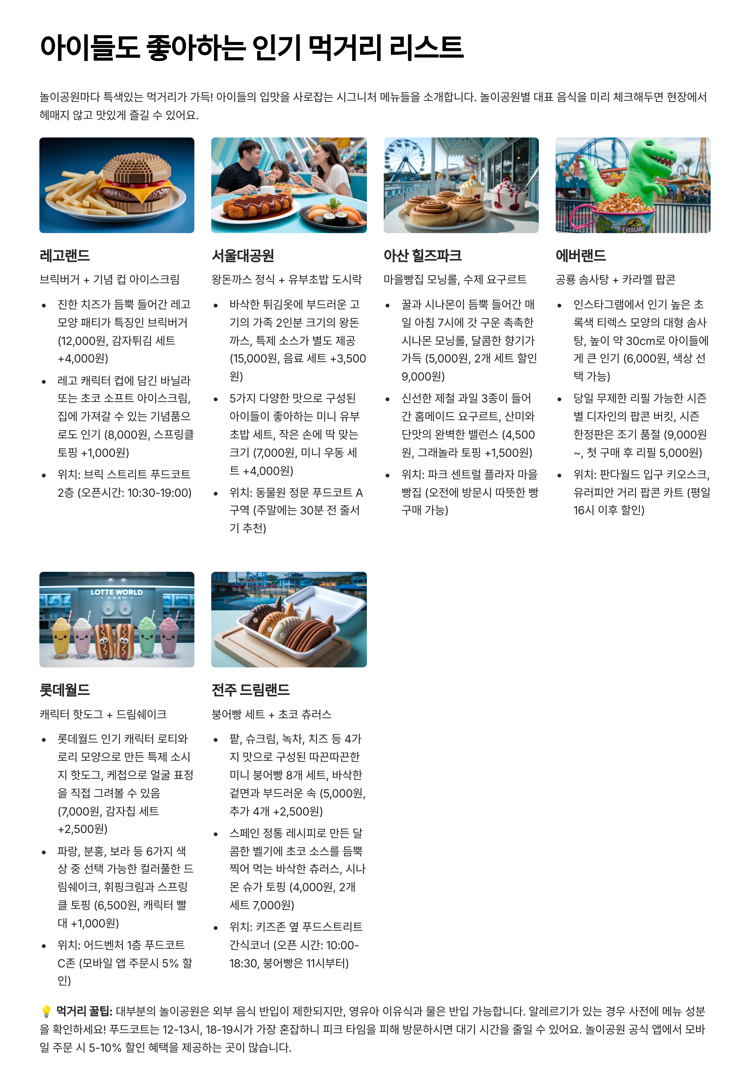 브릭버거, 캐릭터 젤리, 수제 핫도그, 테마파크 한정판 음료 등이 인기예요. 기념품으로도 남기기 좋아서 아이들이 더 좋아하죠!