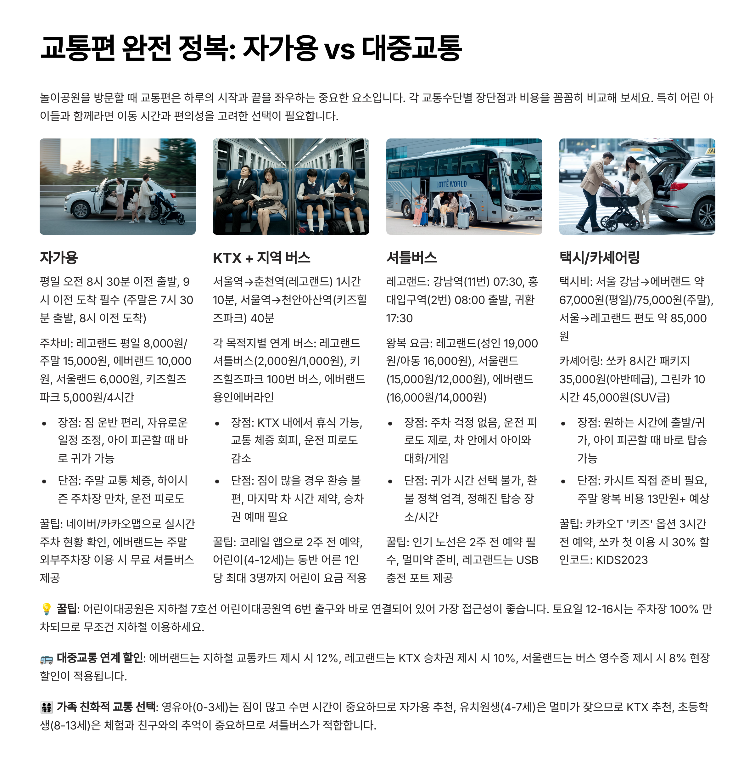 - 전세버스/셔틀버스 이용: 레고랜드, 서울랜드는 공식 셔틀 운영 (사전 예약 필수)