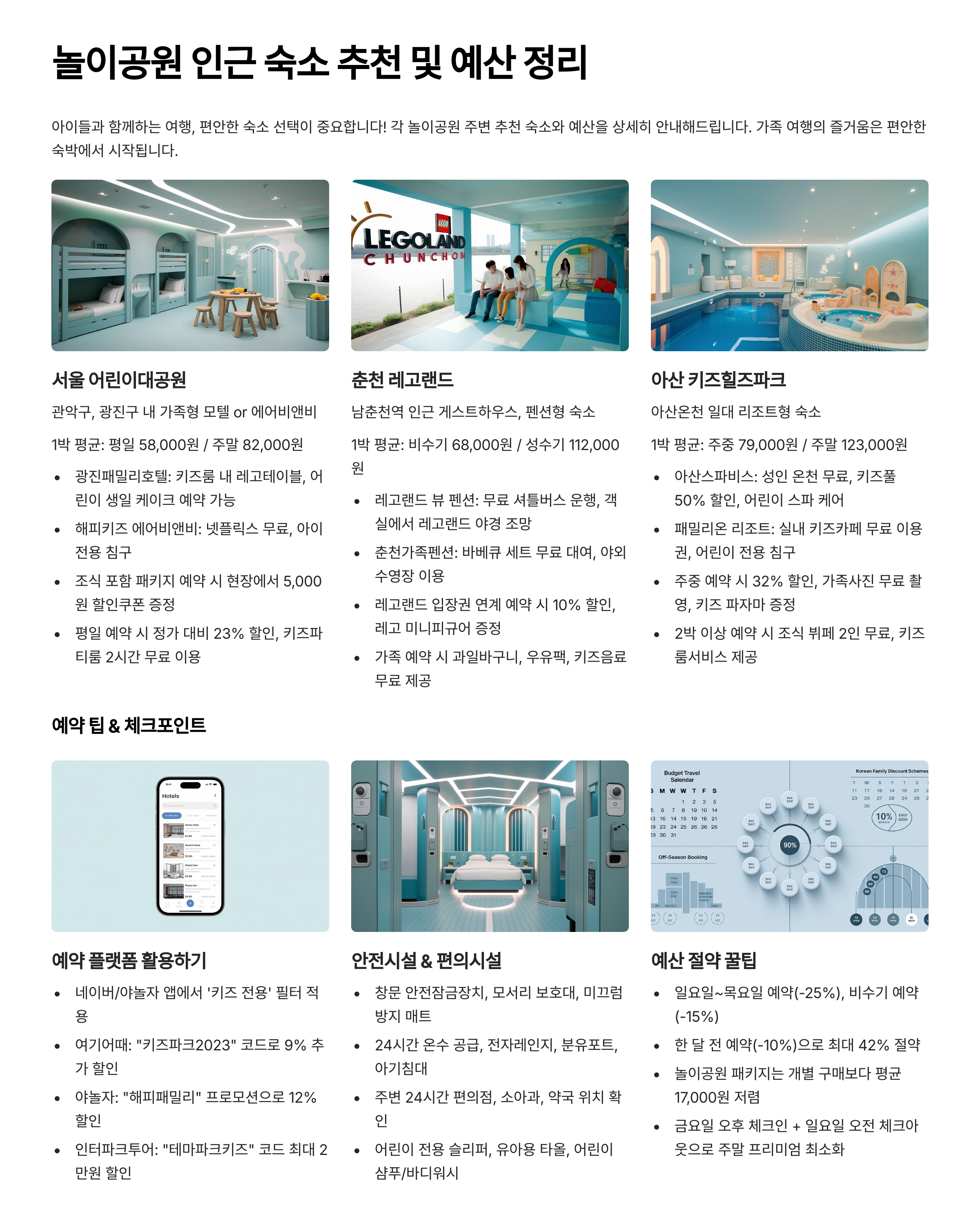 | 서울 어린이대공원 | 관악구, 광진구 내 가족형 모텔 or 에어비앤비 | 60,000~80,000원 |