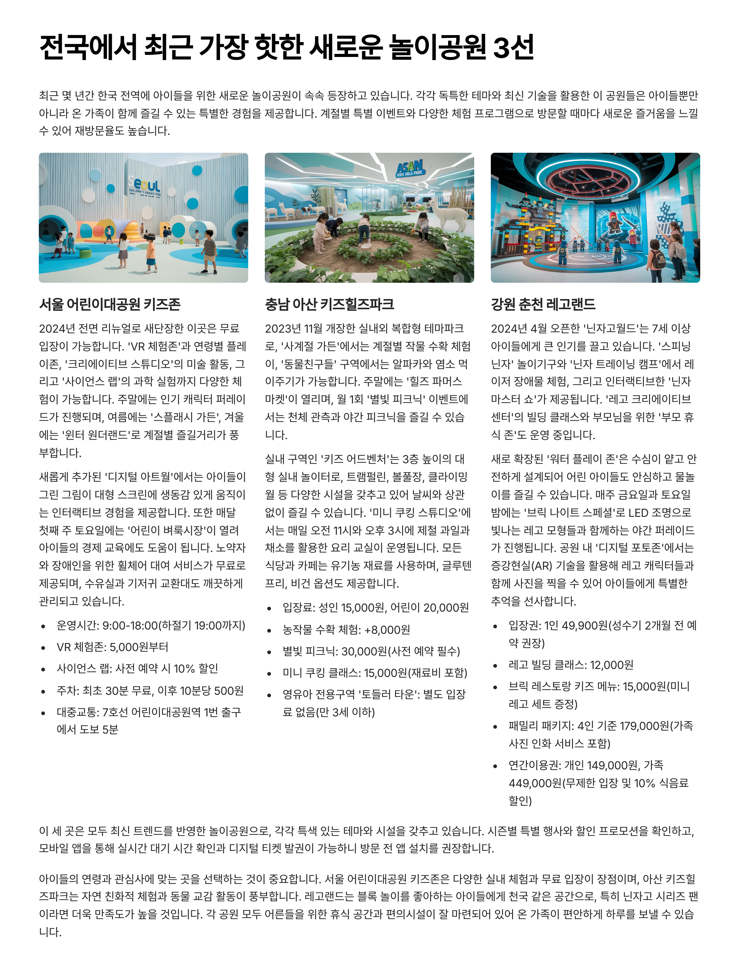 - 서울 어린이대공원 키즈존 리뉴얼 (2024): 무료 입장 가능, VR 체험존과 워터슬라이드 신설