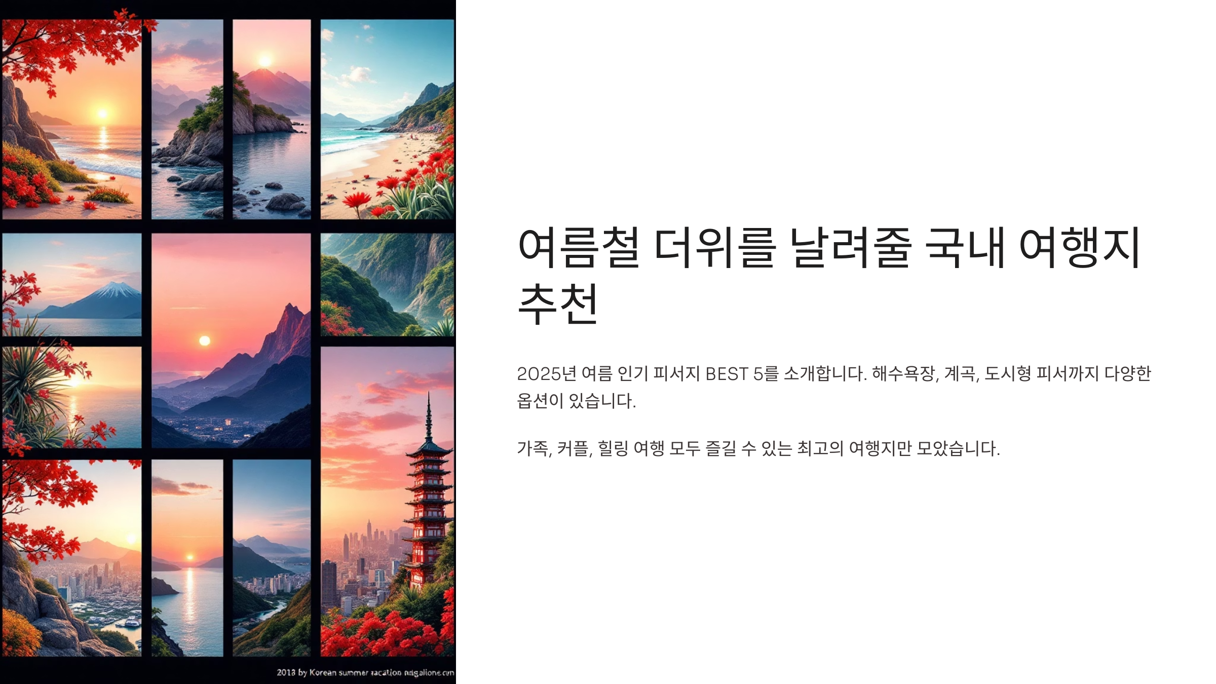 오늘은 다가올 무더위에 대비해서 시원한 여름 휴양 장소에 대해 알아보도록 하겠습니다.