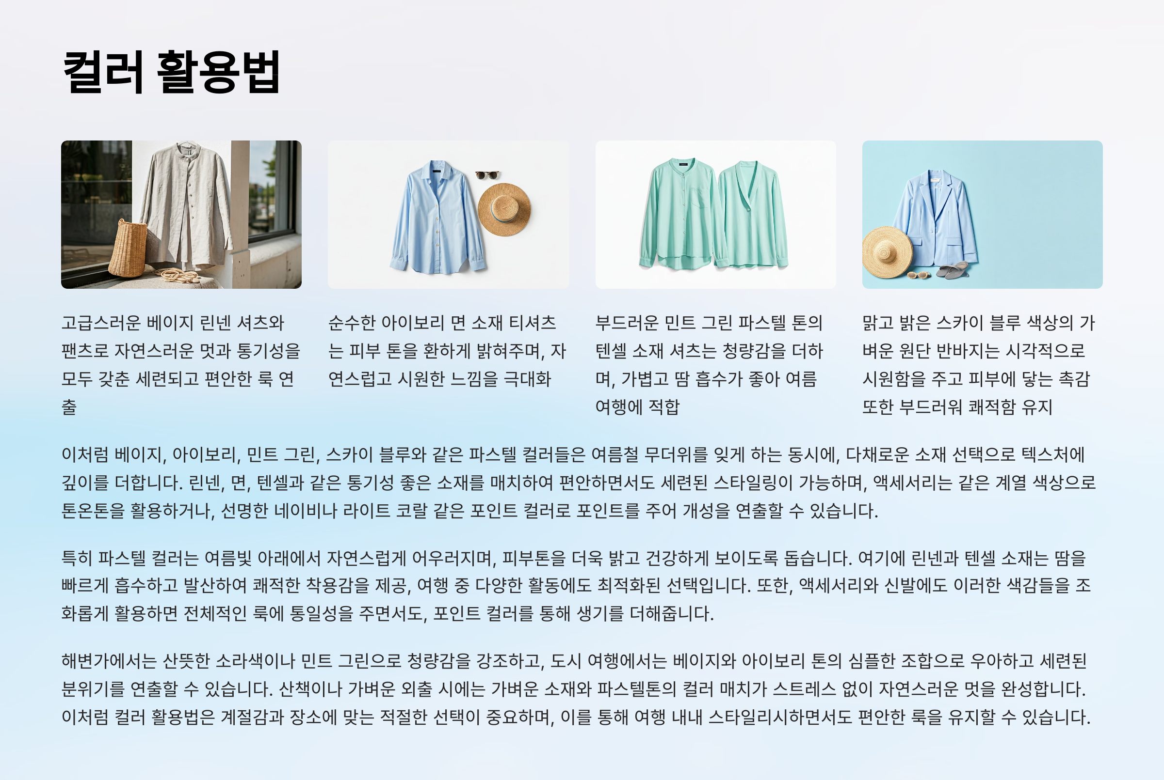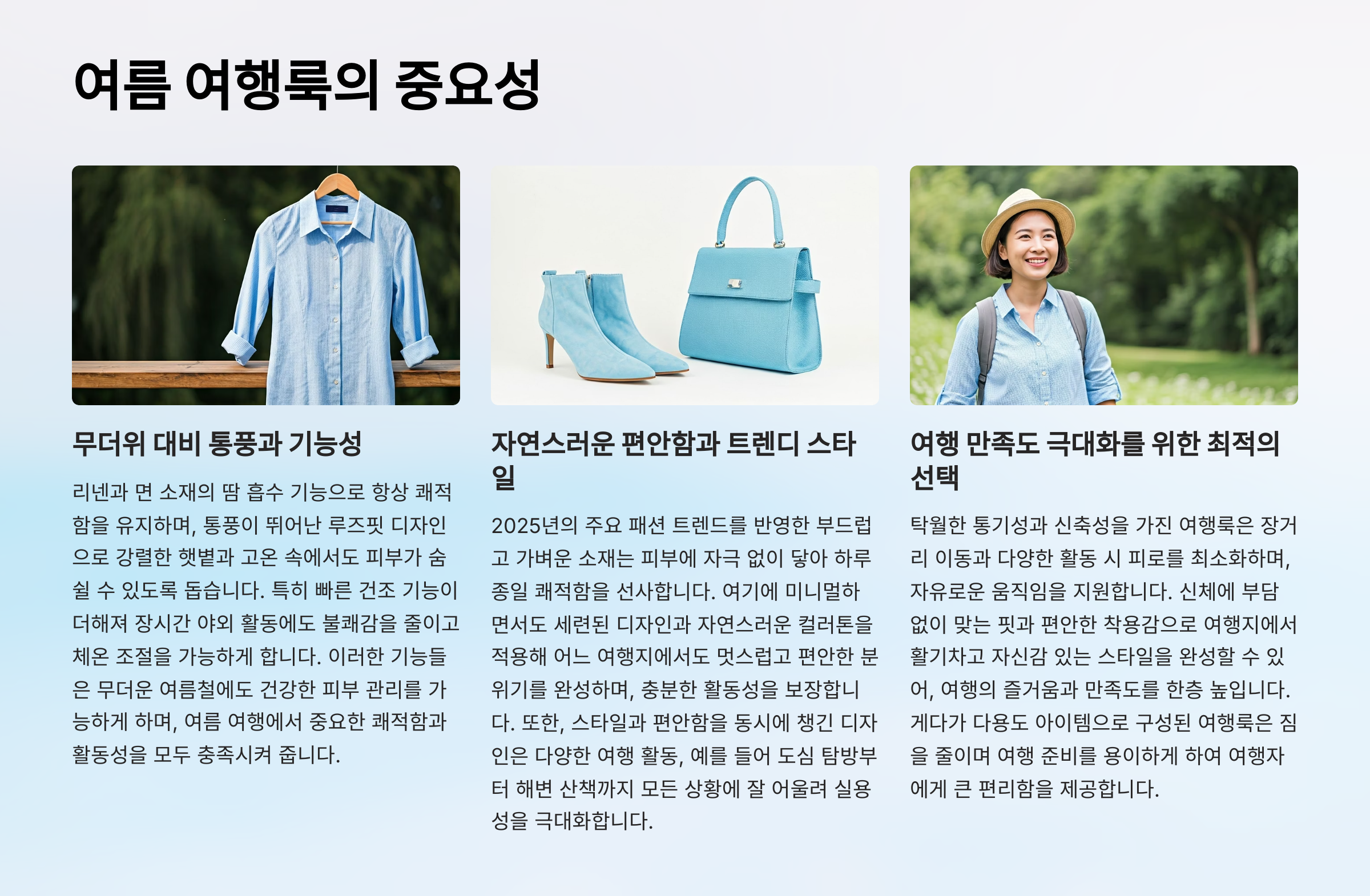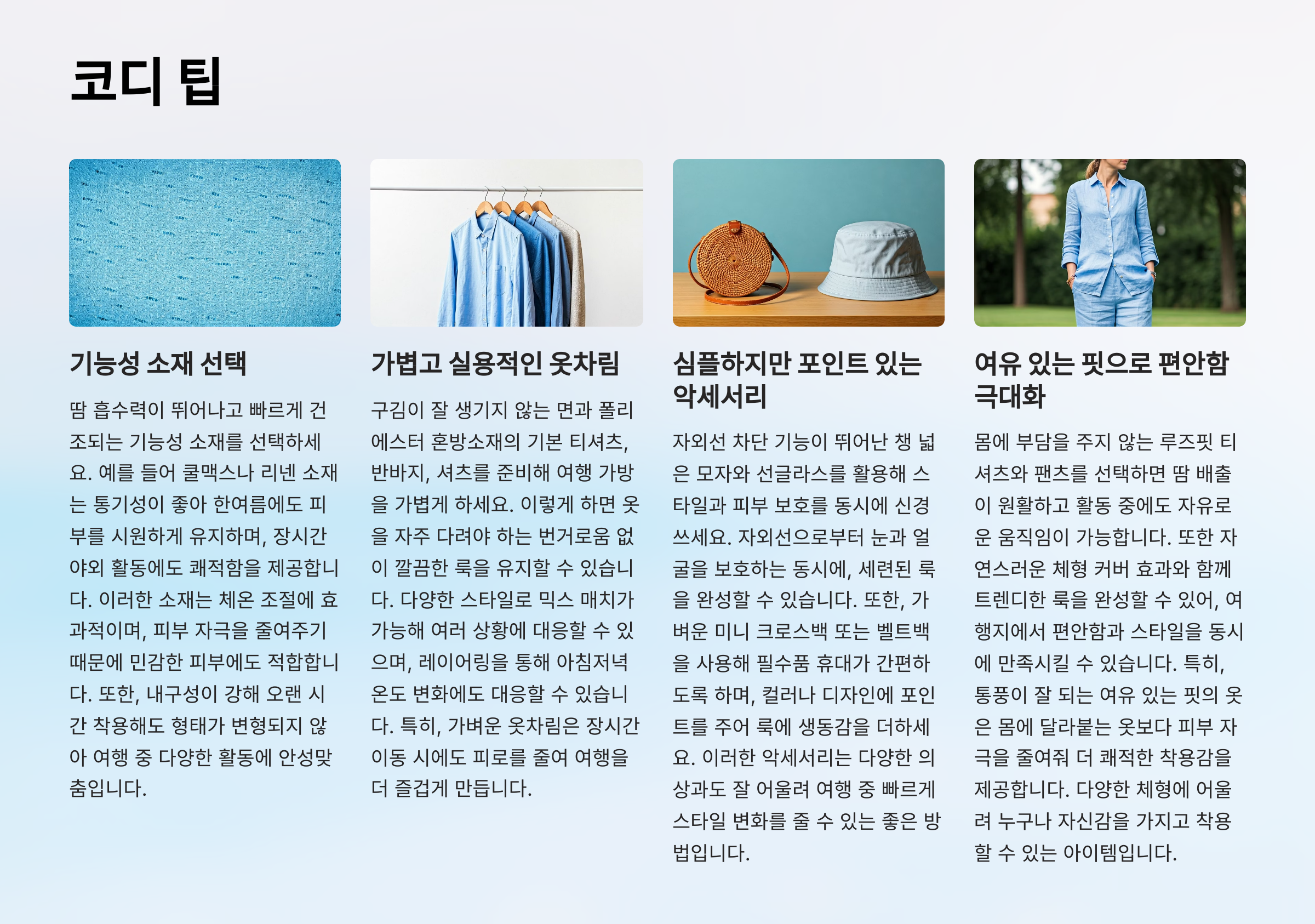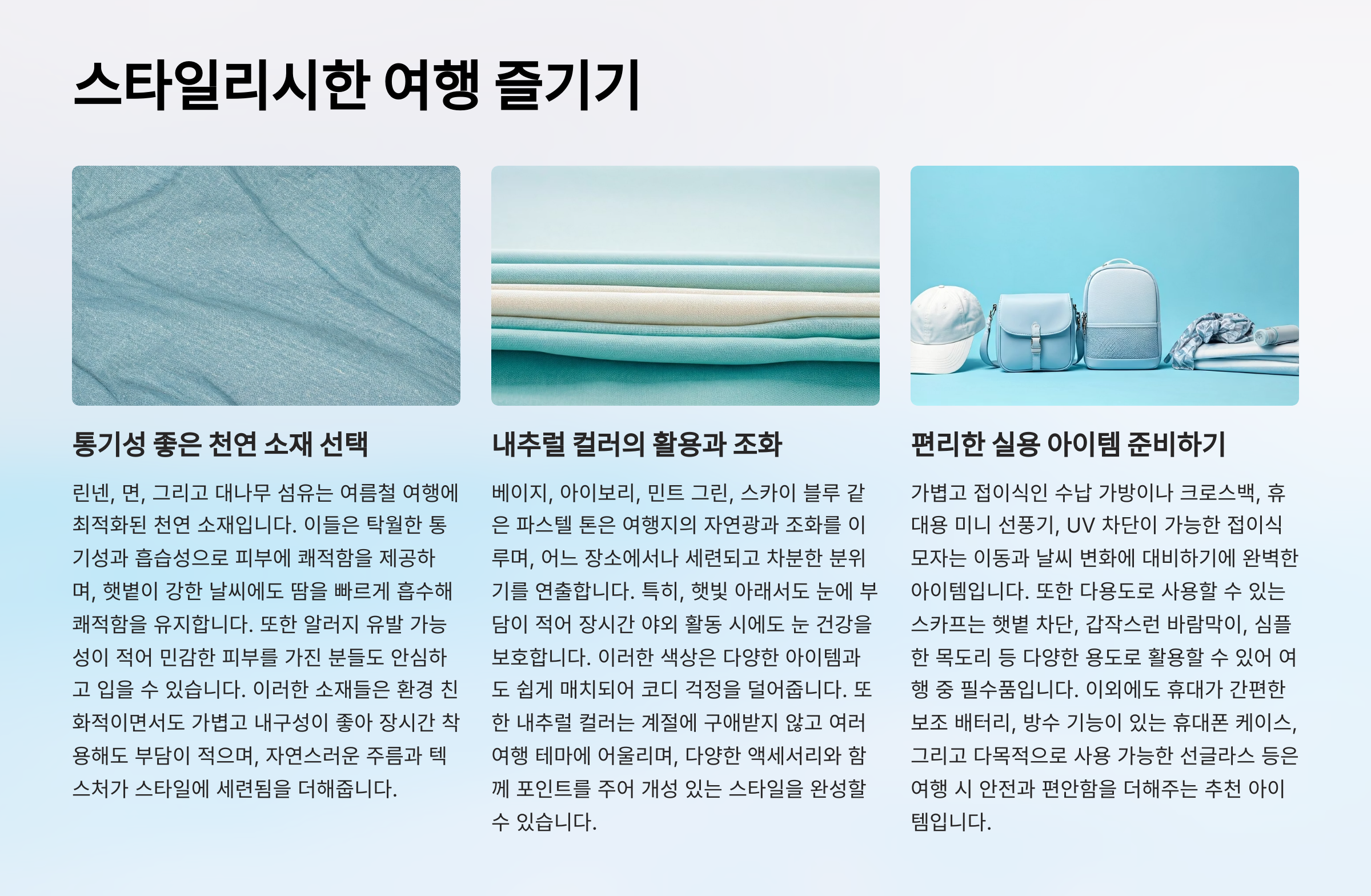 - 밝은 컬러 활용: 밝고 화사한 색상의 옷은 시각적으로도 시원해 보이며, 여행지 사진에도 더욱 생동감을 줍니다.