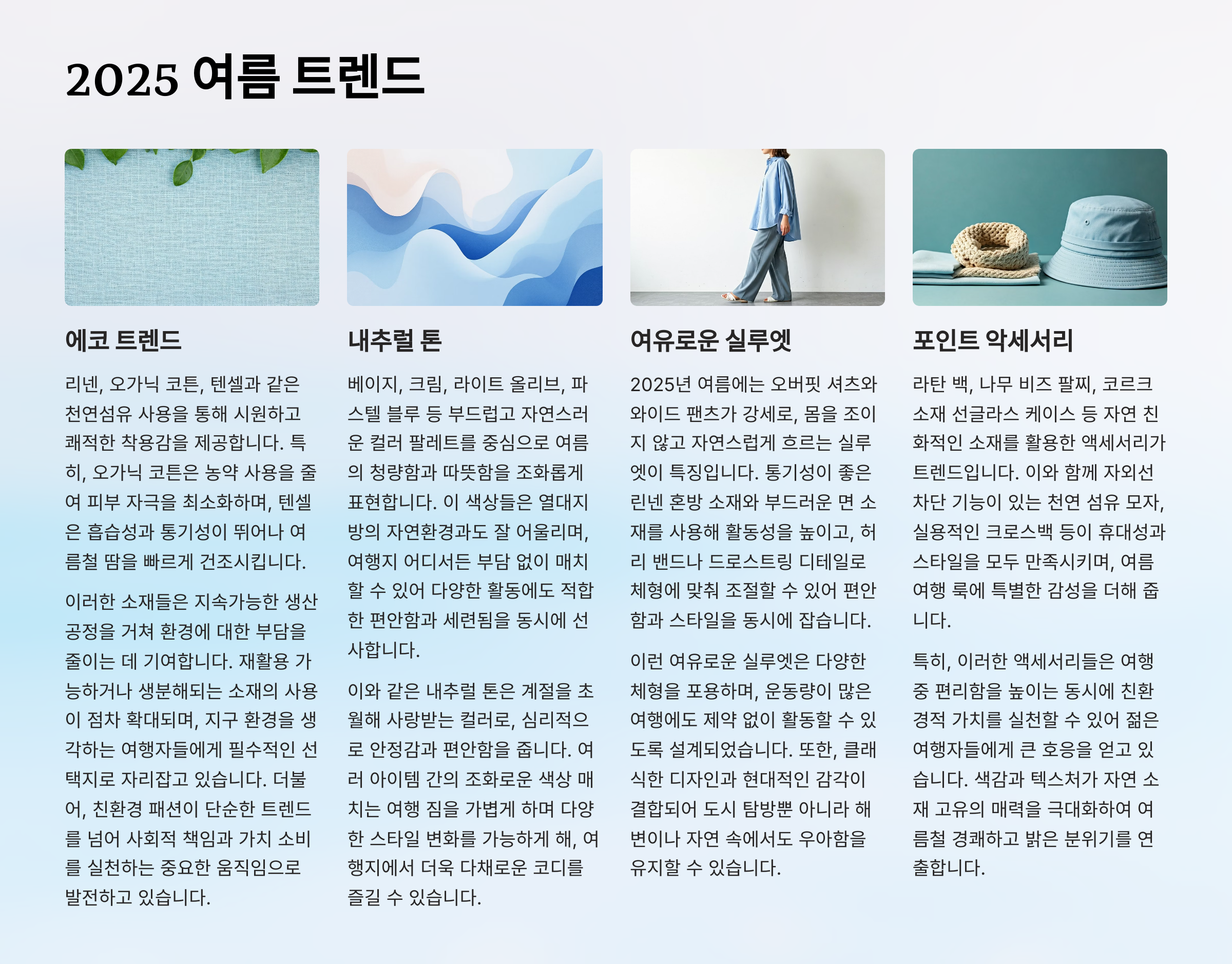 2025년 여름 트렌드는 '편안함'과 '자연스러움'을 강조하고 있으며, 기능성과 패션을 동시에 만족시키는 것이 포인트입니다.
