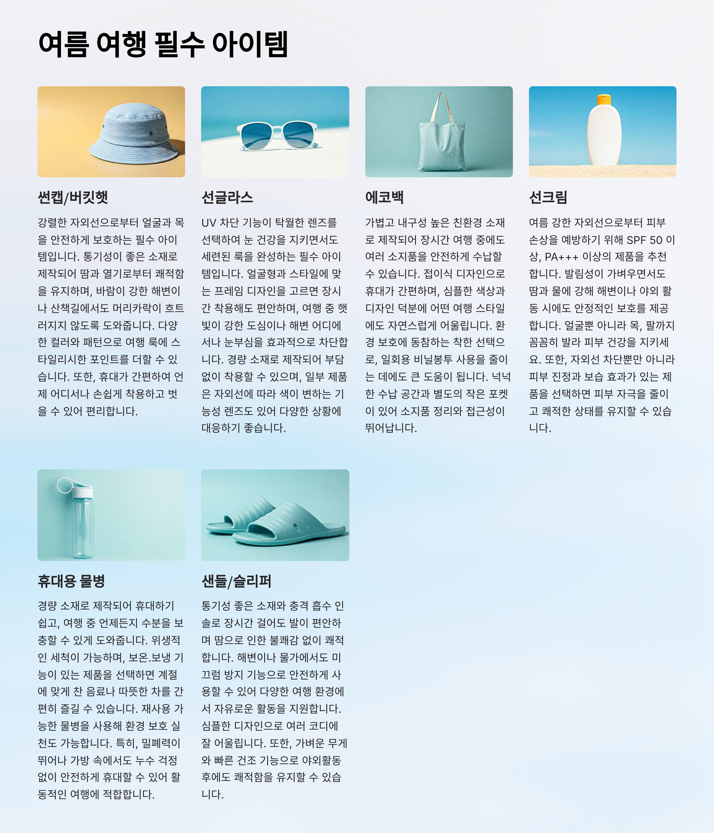 시원한 소재와 밝은 컬러, 실용적인 아이템을 갖춘다면 어떤 여행지에서도 멋진 추억을 남길 수 있을 것입니다.
