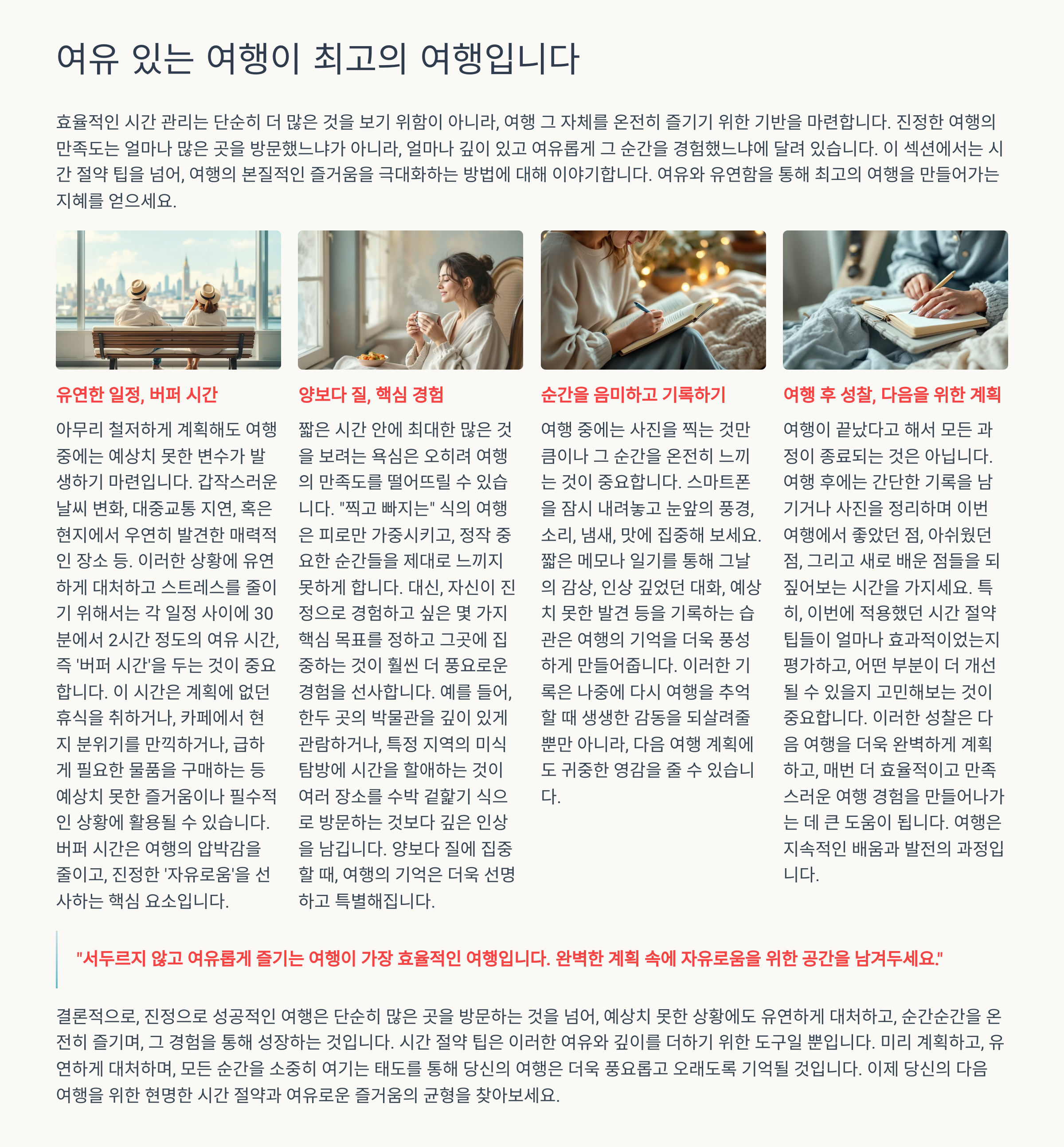 여행은 길이보다 질입니다. 짧은 시간에도 충분히 즐거운 여행이 가능하다는 것을 기억하세요.