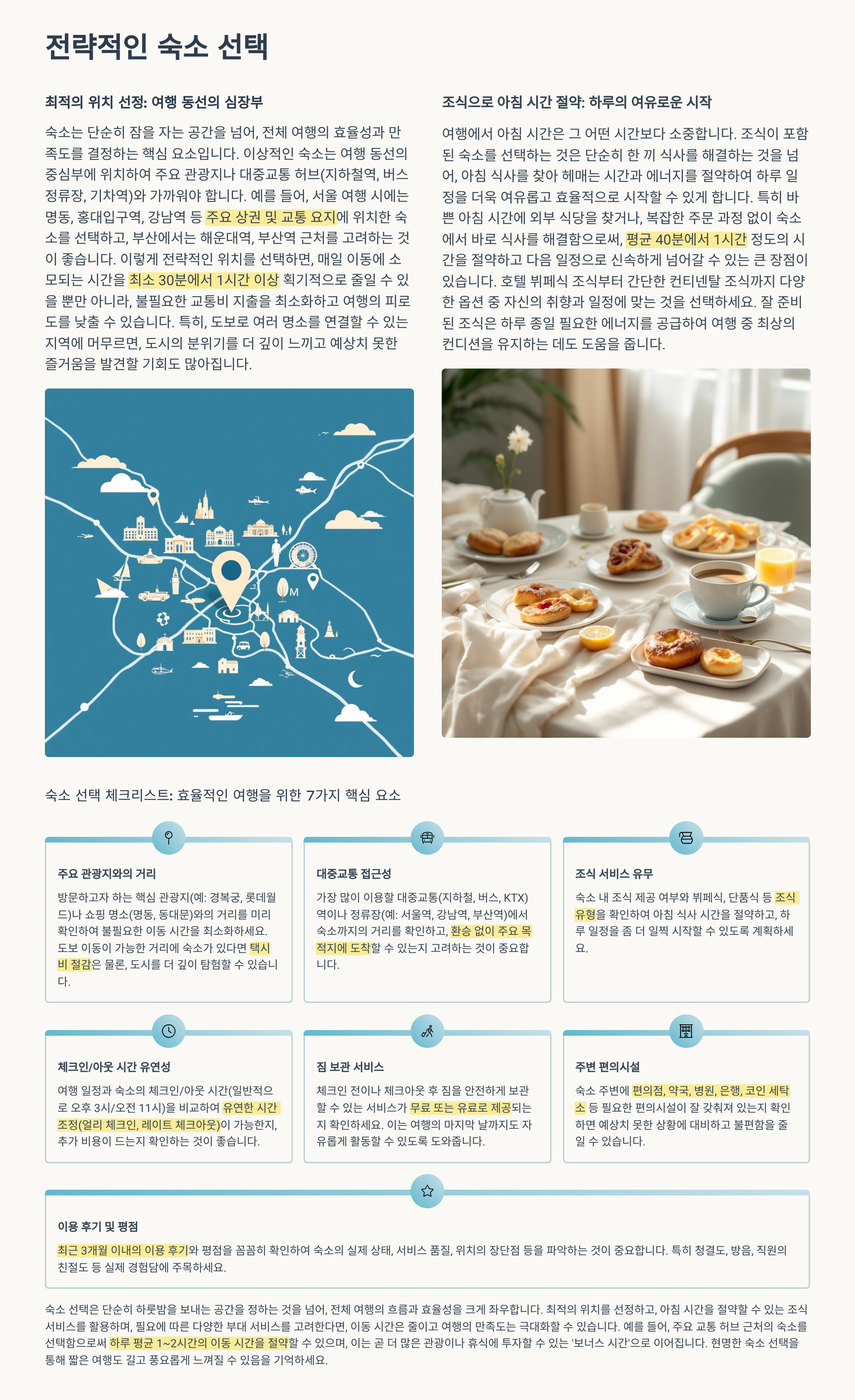 조식이 포함된 숙소를 선택하면 아침 준비 시간도 줄어들어 전체 일정이 여유로워집니다.