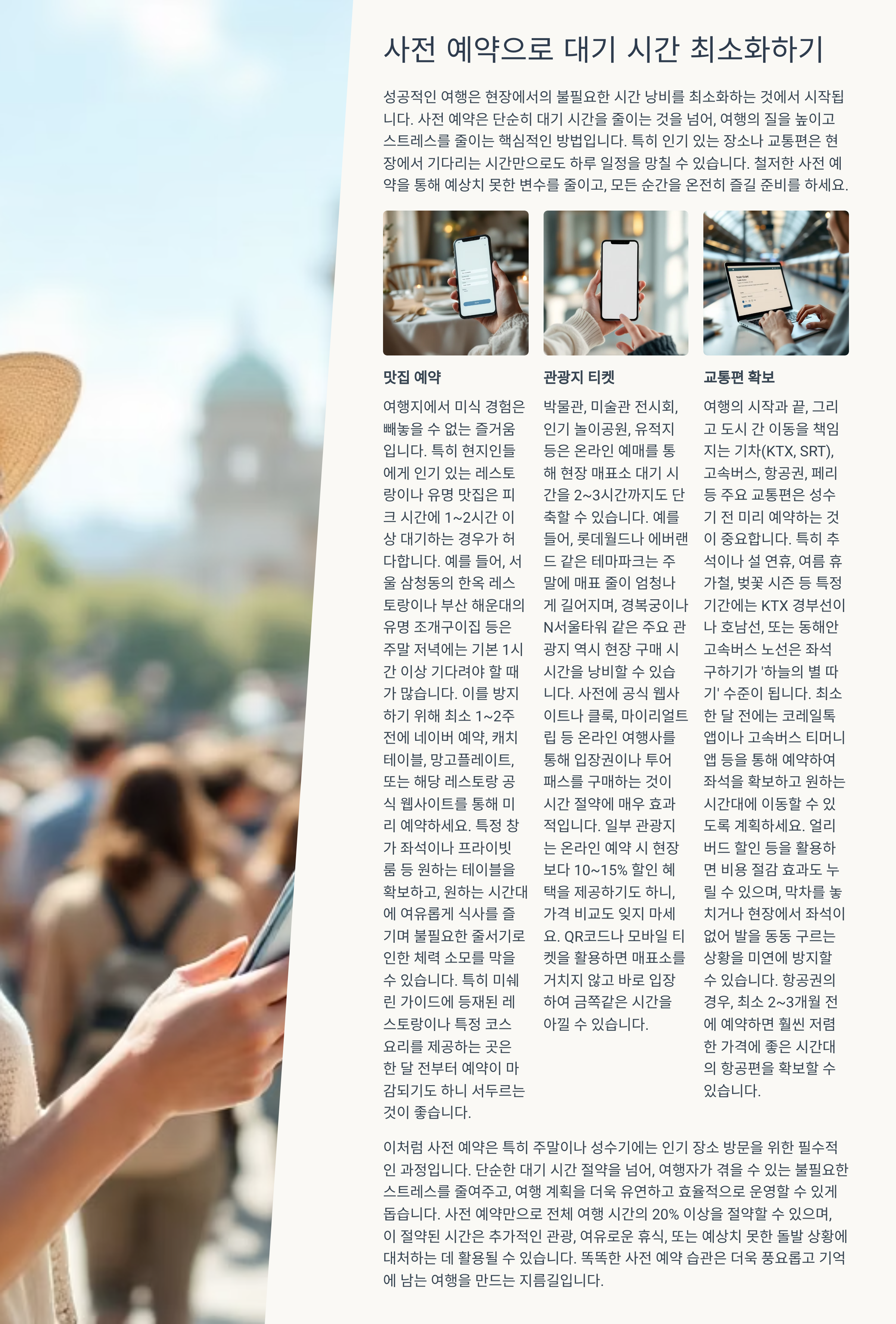 맛집, 전시회, 놀이공원 등은 예약만으로도 2~3시간 절약 가능합니다.