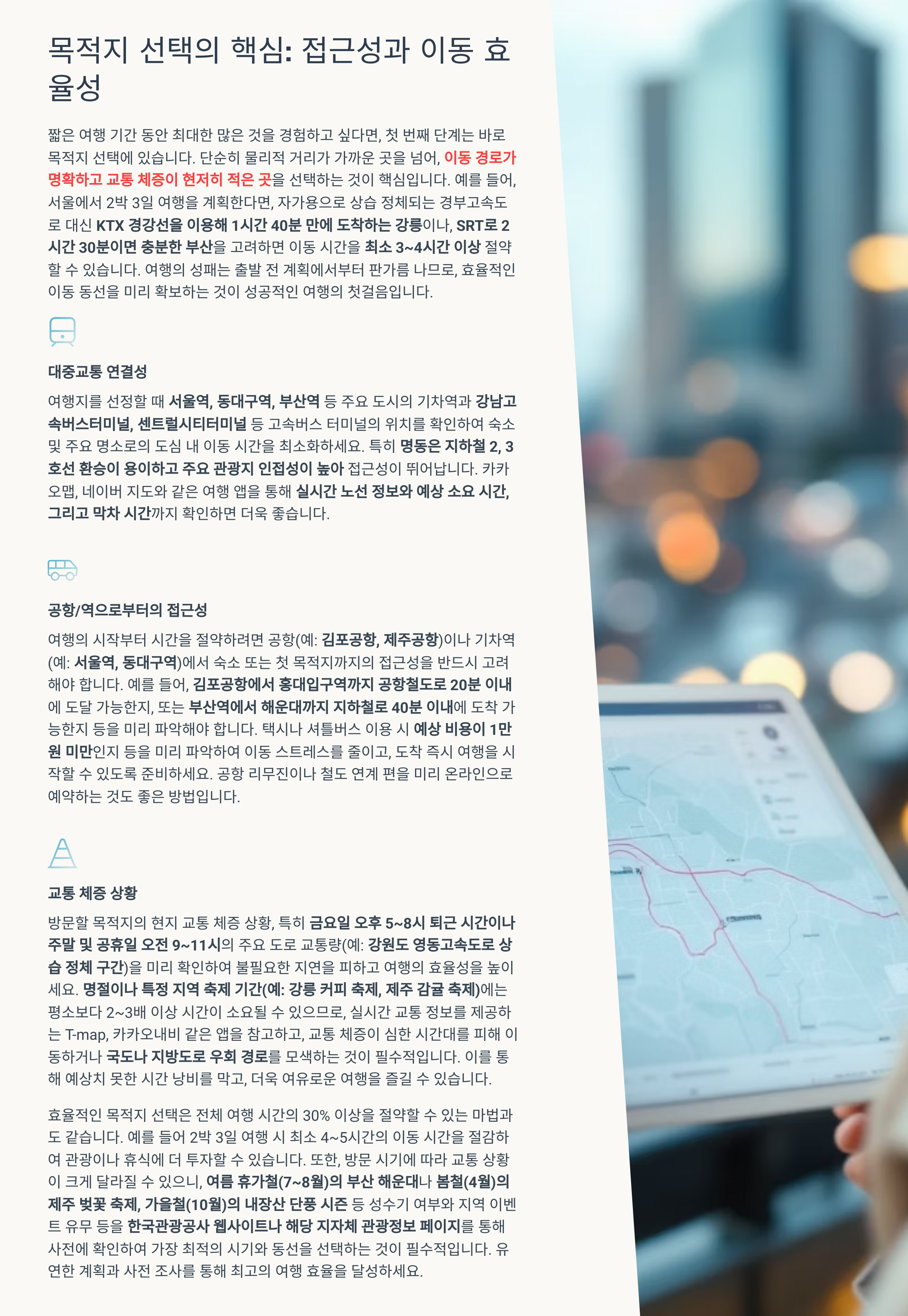 고속도로 정체 구간을 피하거나 대중교통이 편리한 도시형 여행지를 고려해 보세요.