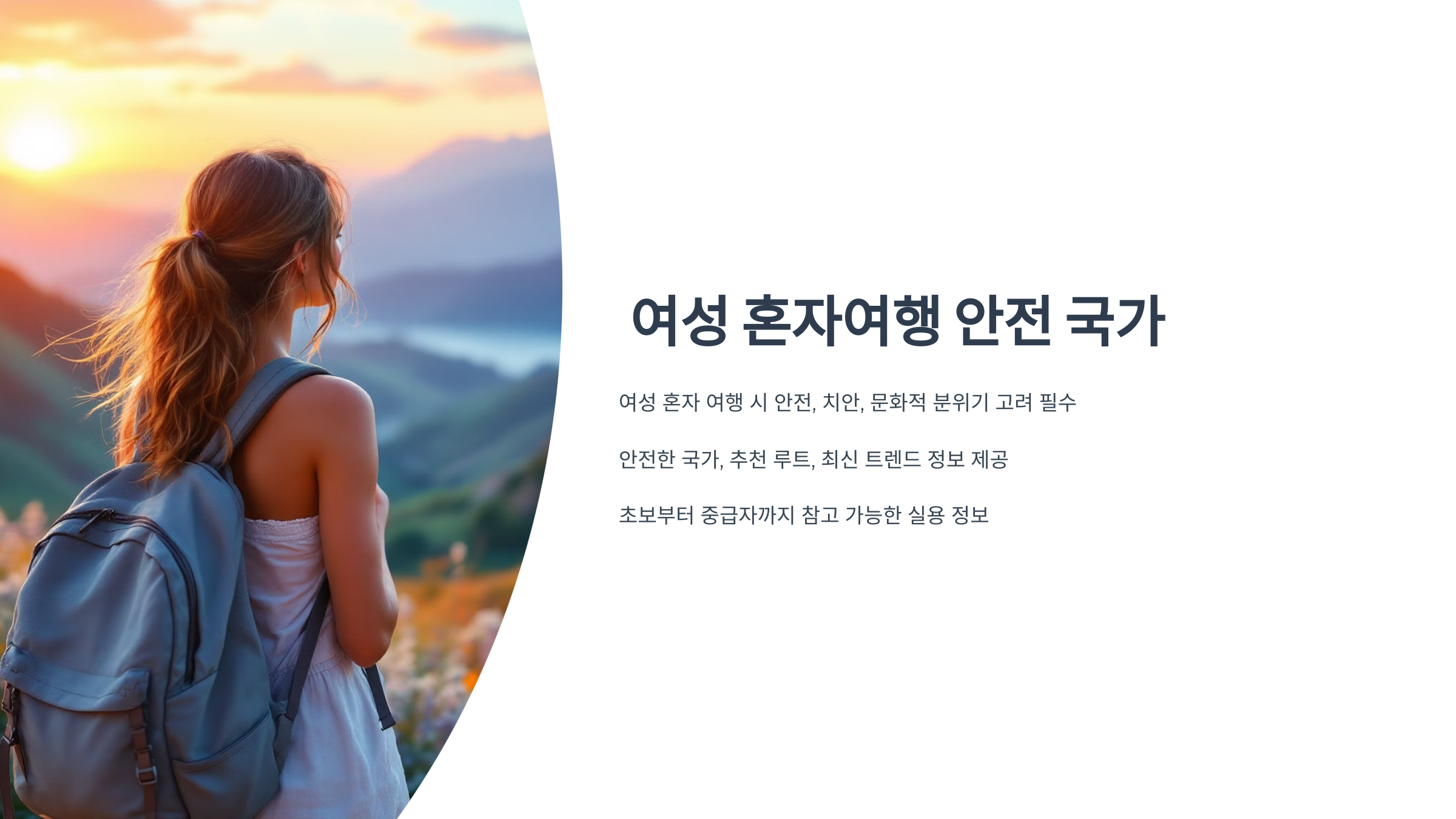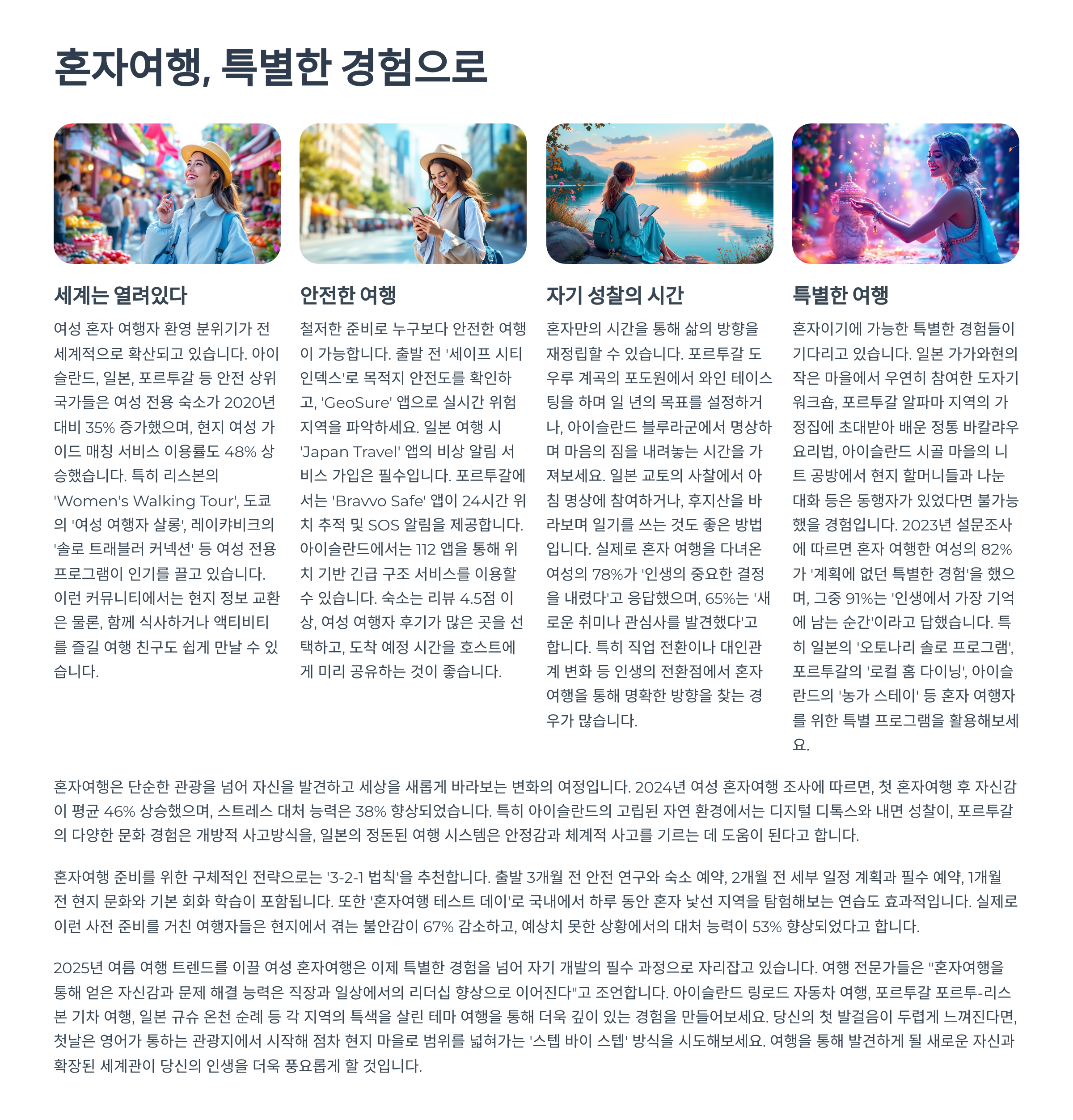 이번 글에서는 여성 혼자 여행 시 안심하고 방문할 수 있는 안전한 국가와, 추천 루트, 그리고 2025년 여름 기준 최신 트렌드까지 한눈에 정리해 드립니다.