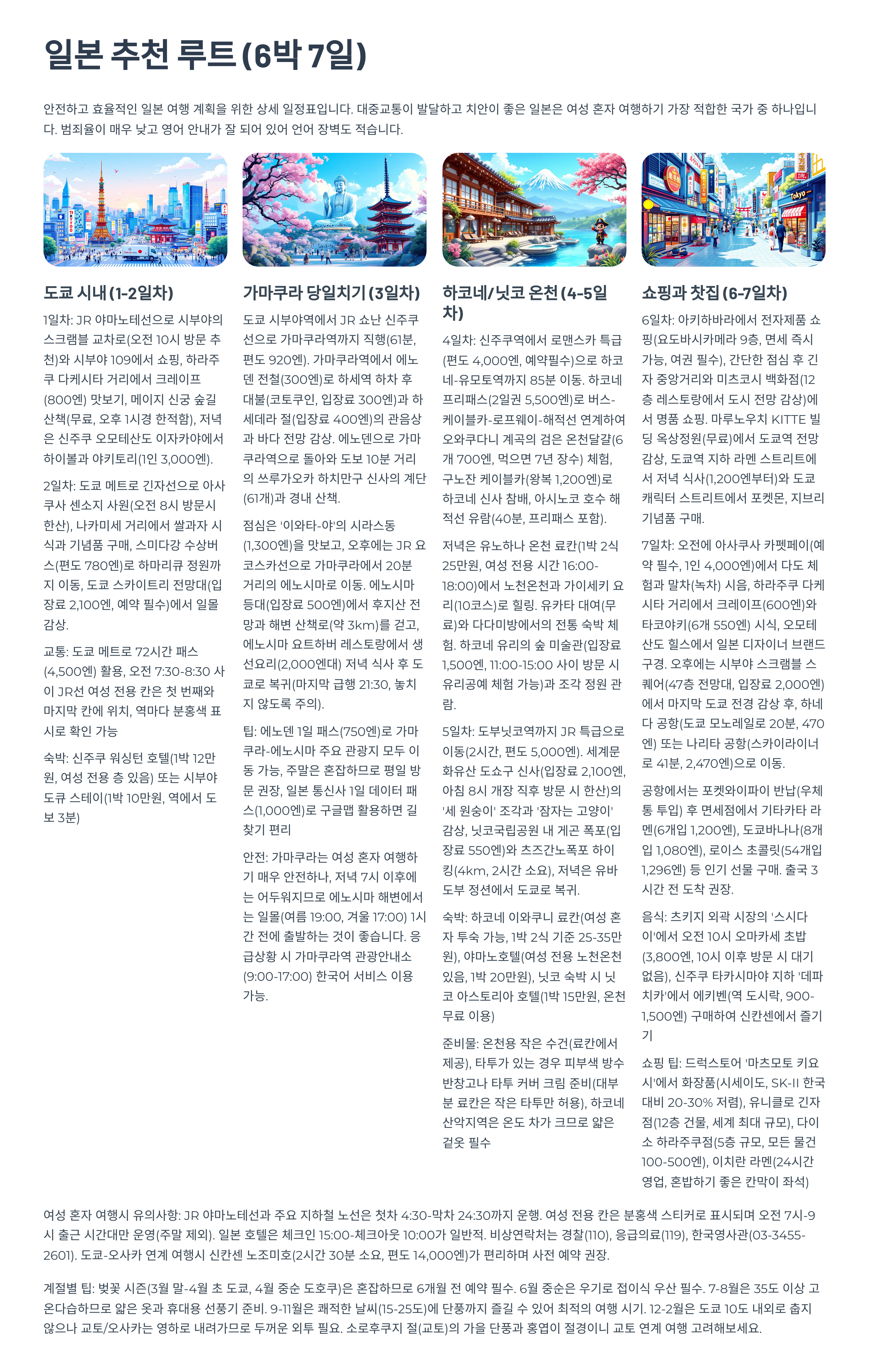 - 일본: 한국과 가까우며, 시스템적으로 여성 전용칸, 전용 숙소, 전용 스파 등 여성 혼자여행자를 위한 인프라가 매우 잘 되어 있습니다. 치안도 아시아 최상위권으로 평가됩니다.
