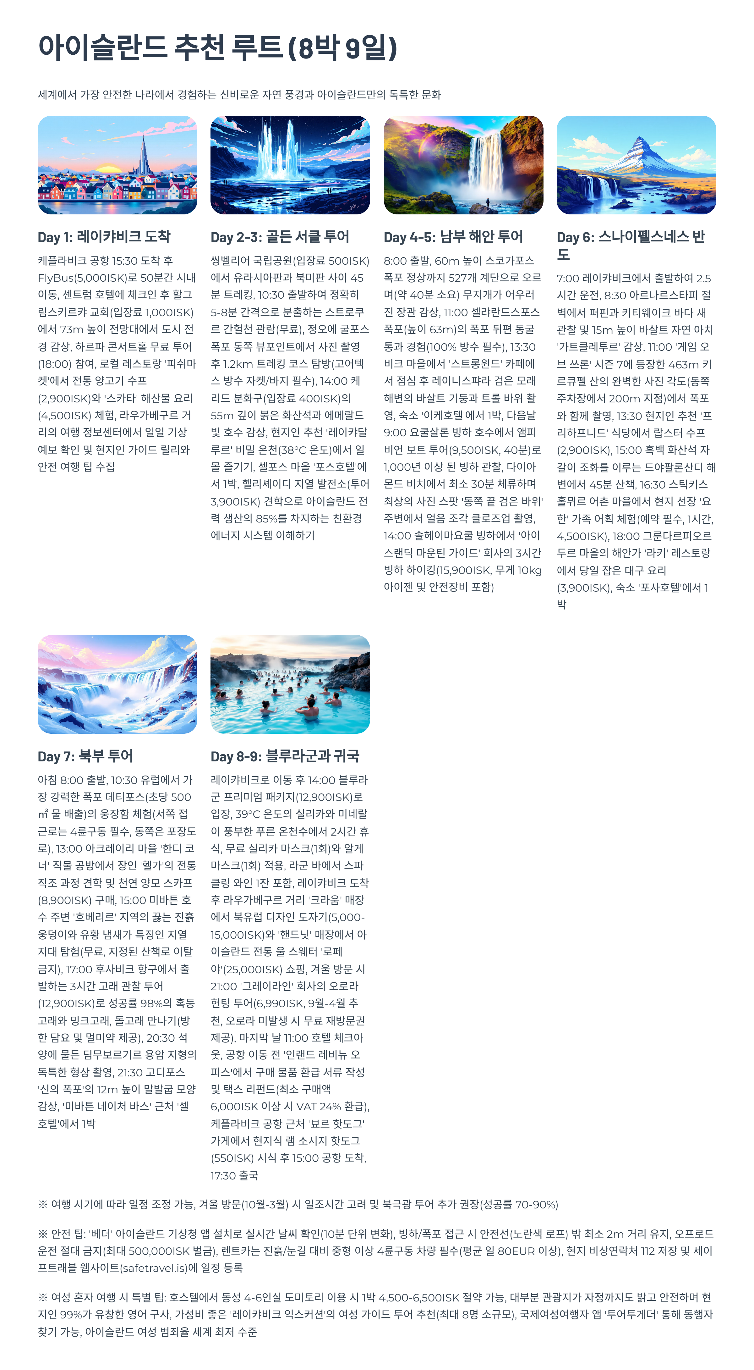 - Day 6~7: 남부 해안 투어 (비크 해변, 요쿨살론 빙하호수, 다이아몬드 비치)