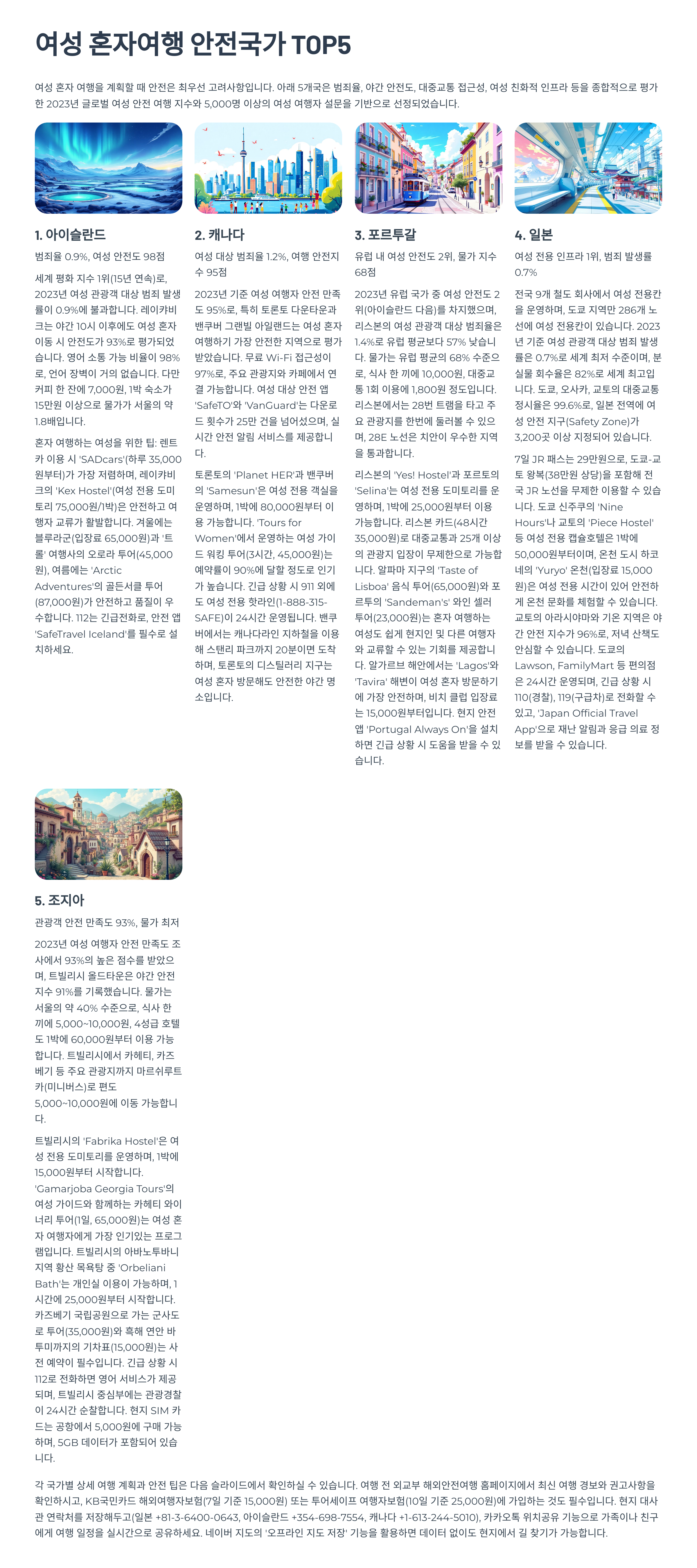2025년 현재, 여러 글로벌 여행 리서치 기관과 여성 커뮤니티 기반의 실제 후기를 참고하여 선정된 여성 혼자여행 안전국가 TOP5는 다음과 같습니다: