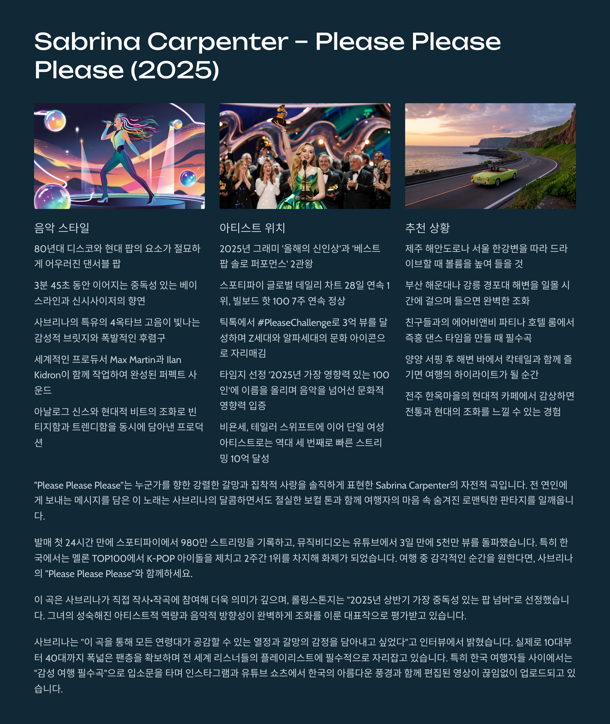 경쾌하면서도 부드러운 감성의 팝송을 선보이는 Sabrina Carpenter는 요즘 가장 주목받는 여성 아티스트 중 하나입니다. 2025년 신곡 “Please Please Please”는 밝고 경쾌한 리듬에 섬세한 감정이 얹어져 있어, 드라이브 중 기분을 환기시켜 주는 완벽한 사운드트랙이에요.
