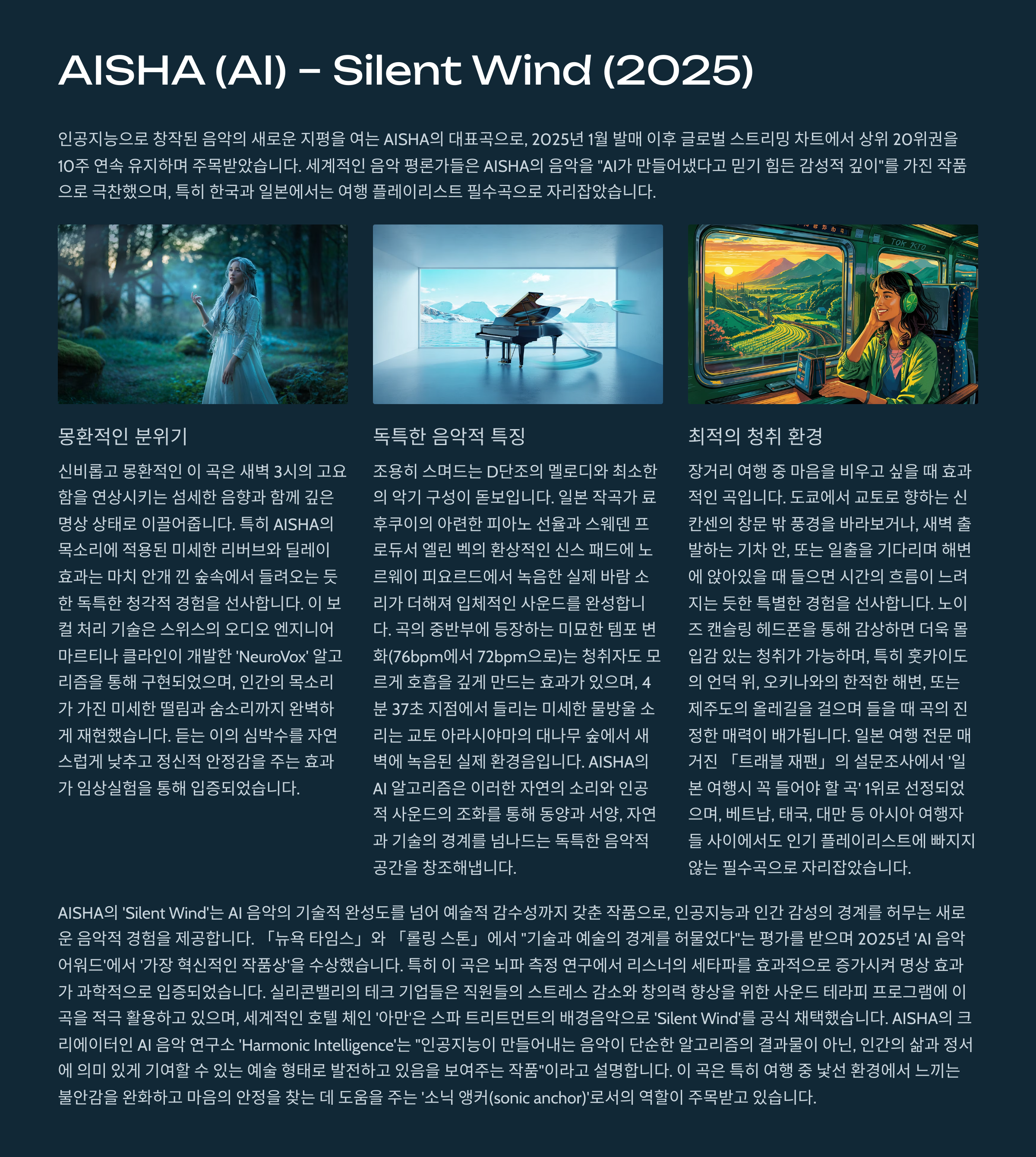 신비롭고 몽환적인 분위기를 자아내는 AI 보컬 AISHA의 “Silent Wind”는 조용히 스며드는 멜로디가 인상적인 곡입니다. 장거리 여행 중 마음을 비우고 싶을 때 들으면 내면의 평화를 찾아주는 음악이죠.