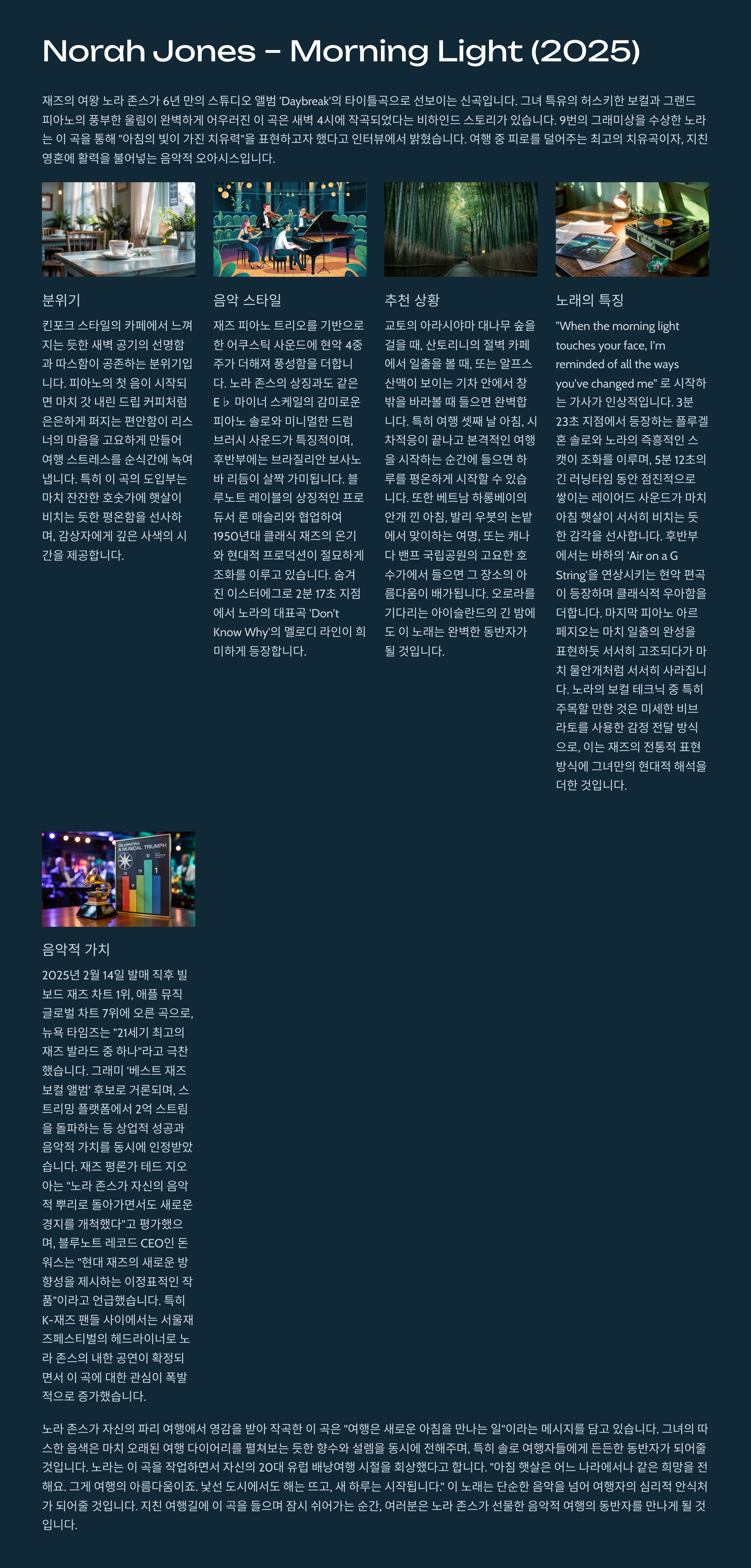 “Morning Light”는 새벽 공기처럼 잔잔하고 편안한 분위기로, 아침 햇살 속 여유로운 여행의 시작에 딱 맞는 곡이에요.