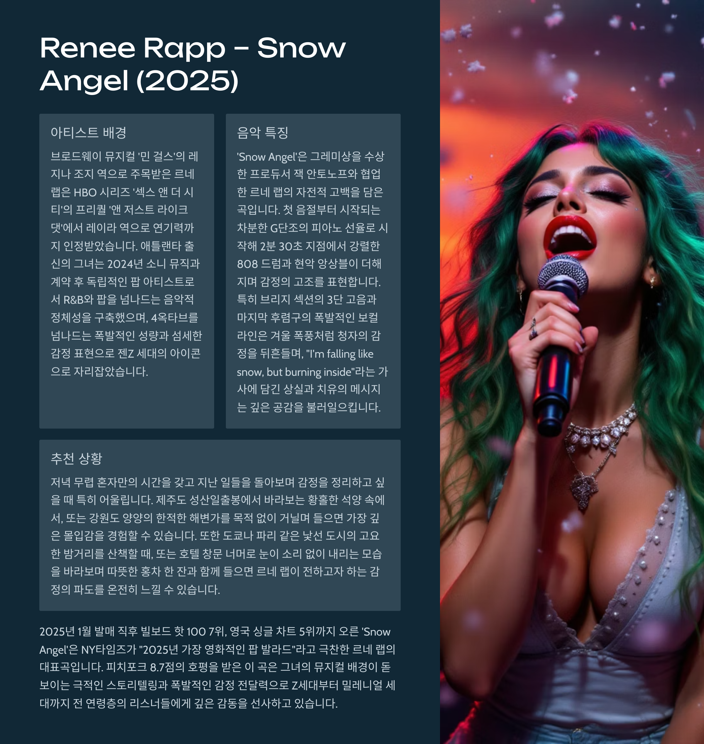 뮤지컬 무대에서 시작해 팝씬에서 두각을 나타내고 있는 Renee Rapp의 “Snow Angel”은 차분하면서도 강렬한 감성의 조화를 보여줍니다. 혼자만의 감정을 정리하거나 석양 아래 풍경을 바라보며 듣기에 아주 좋은 곡이에요.