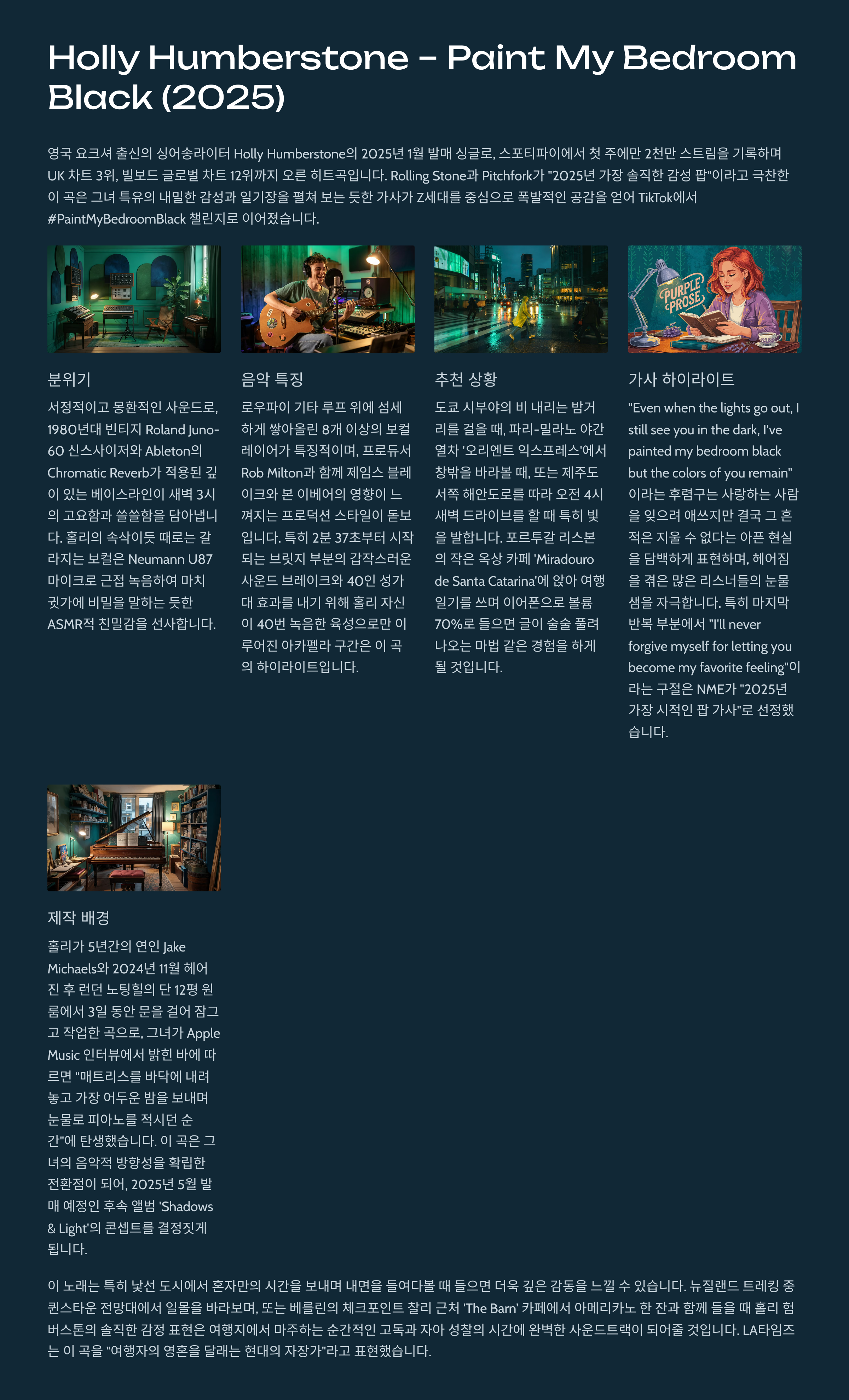 몽환적이고 내면적인 사운드로 유명한 Holly Humberstone의 2025년 신곡 “Paint My Bedroom Black”은 어두운 밤, 혼자만의 감성에 빠지기에 완벽한 곡입니다. 귀에 감기는 부드러운 멜로디가 여행 중 생각에 잠기게 만들죠.