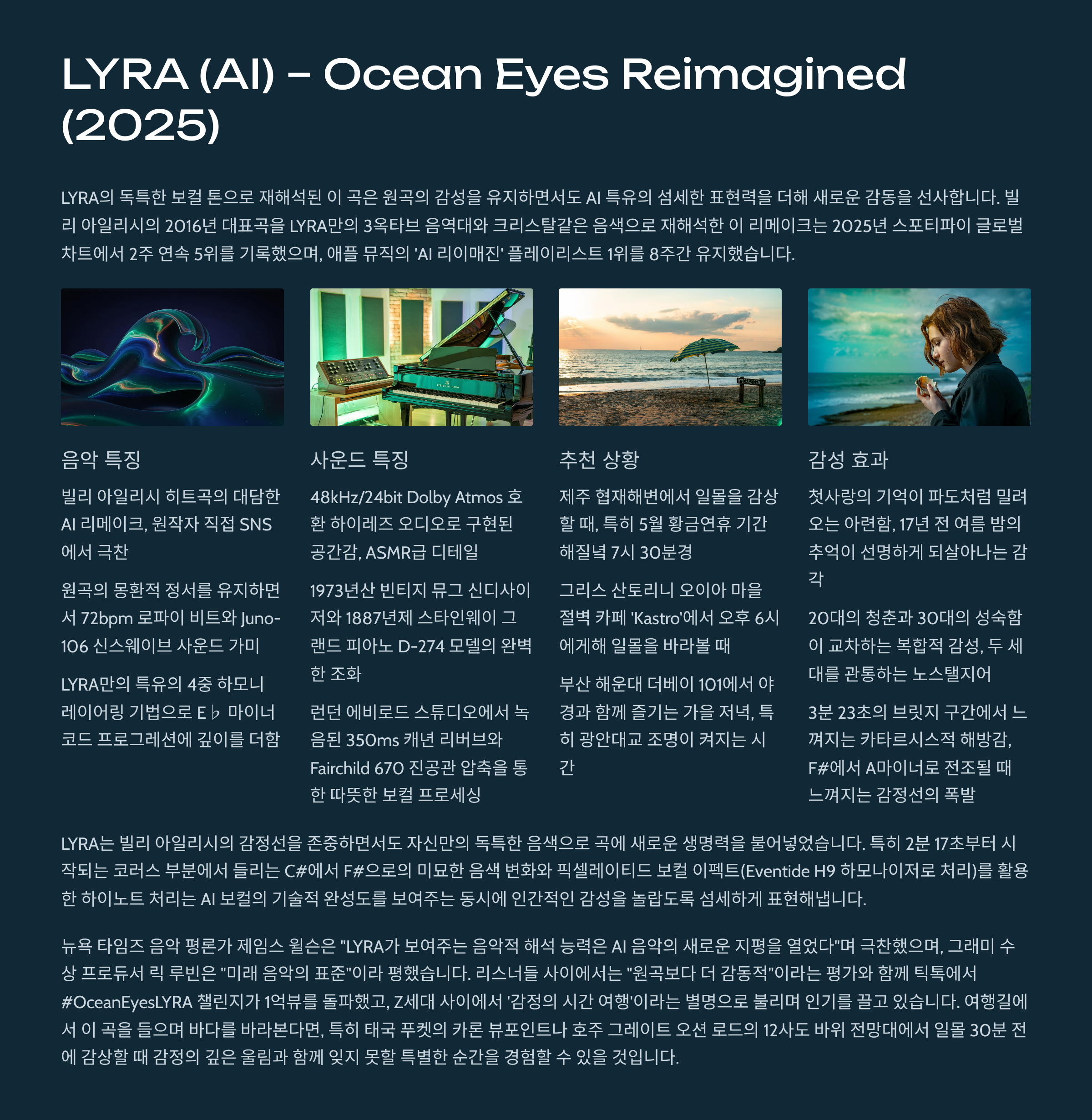 유명한 팝송을 AI 보컬이 새롭게 해석한 버전, LYRA의 “Ocean Eyes Reimagined”는 섬세한 감정선과 따뜻한 리버브가 인상적인 곡입니다.