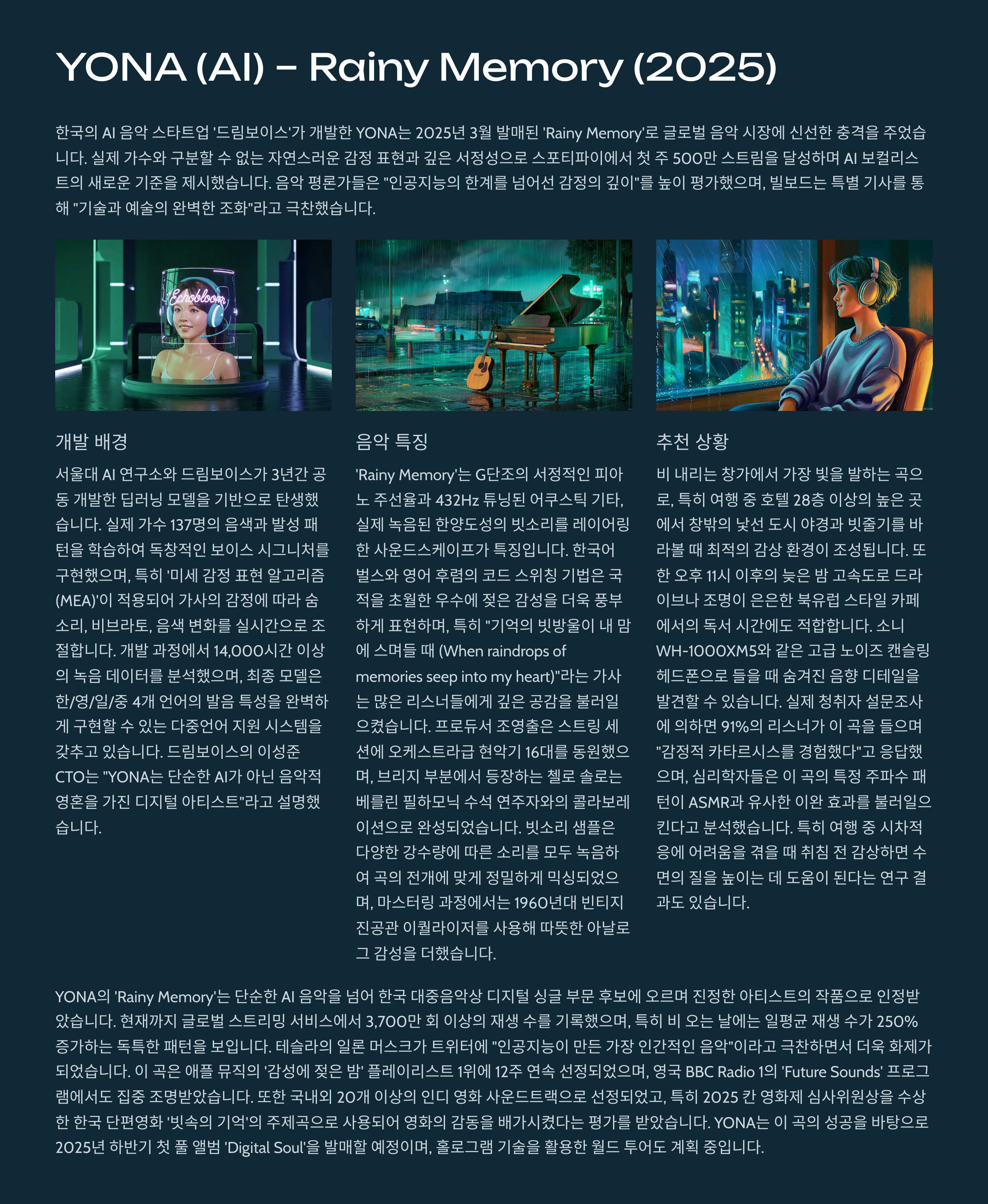 한국에서 개발된 AI 보컬 YONA는 감정선을 정교하게 따라가는 섬세한 음색이 특징입니다.