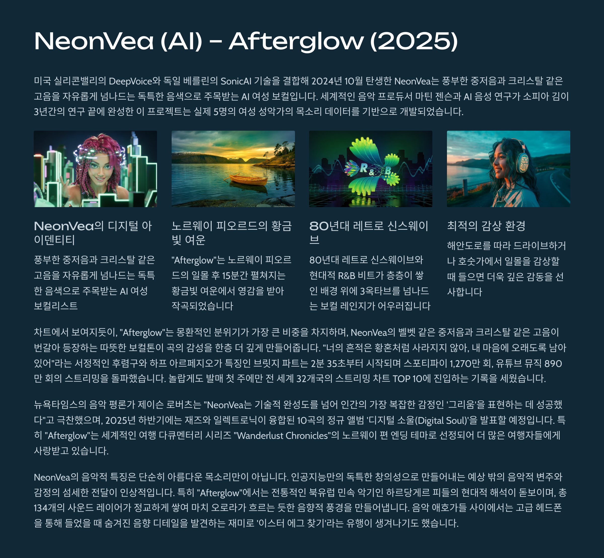 NeonVea는 몽환적이면서도 따뜻한 AI 보컬톤으로 주목받는 아티스트입니다.