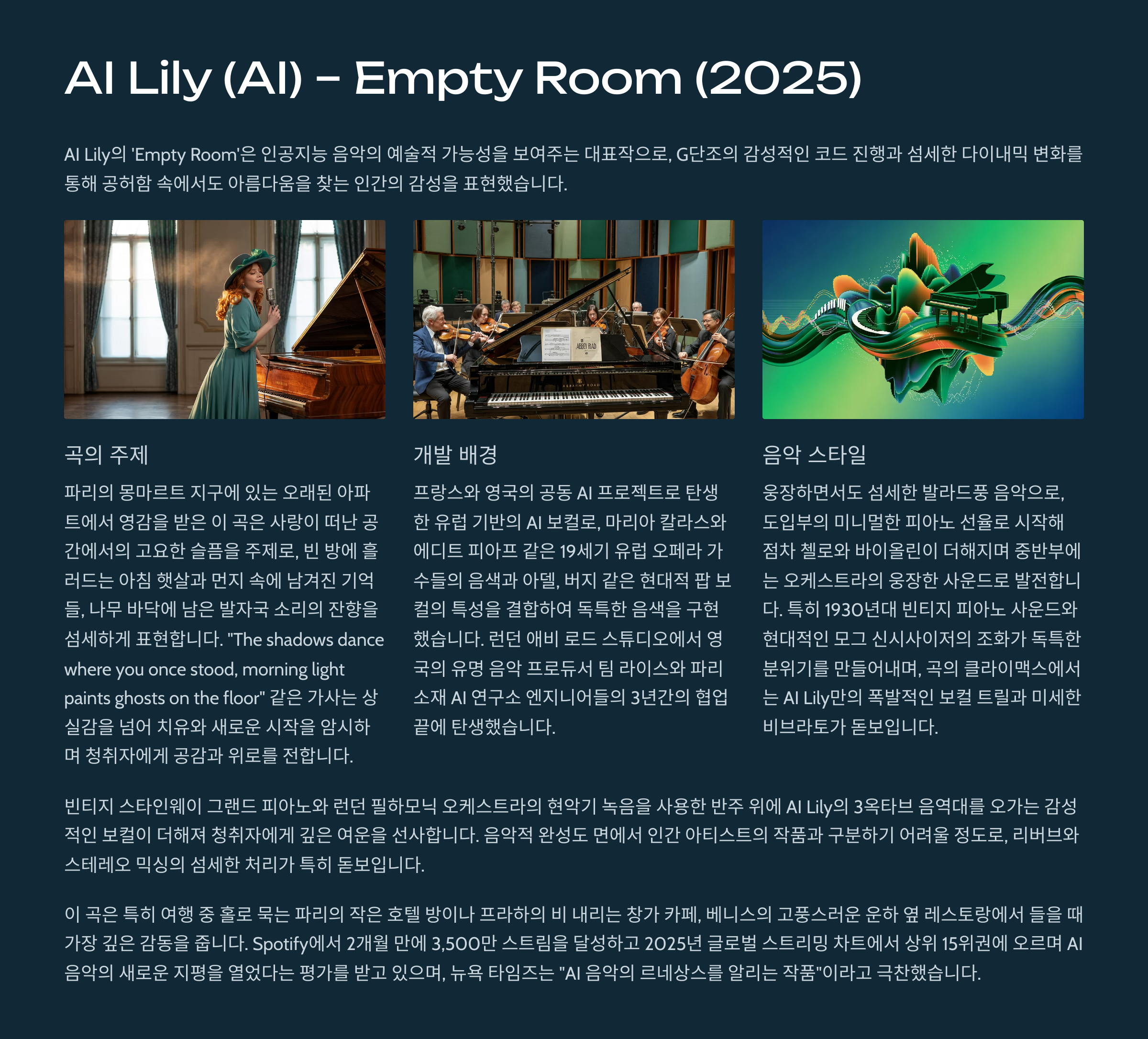 AI Lily는 유럽 기반의 AI 보컬로, 웅장하면서도 섬세한 발라드풍 음악을 선보입니다.