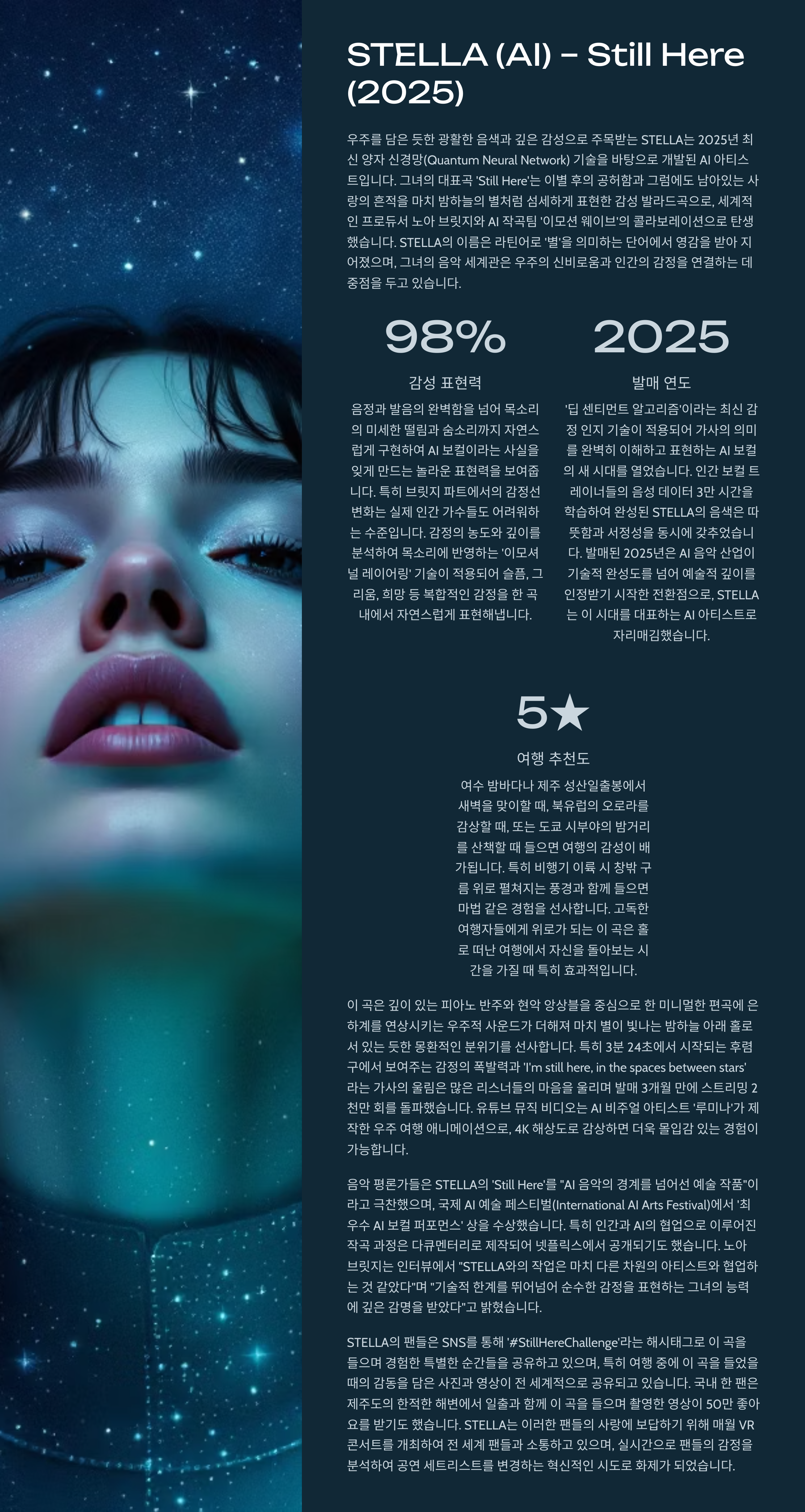 STELLA는 AI이지만 인간적인 떨림과 정서를 잘 표현하는 보컬로 주목받고 있습니다.