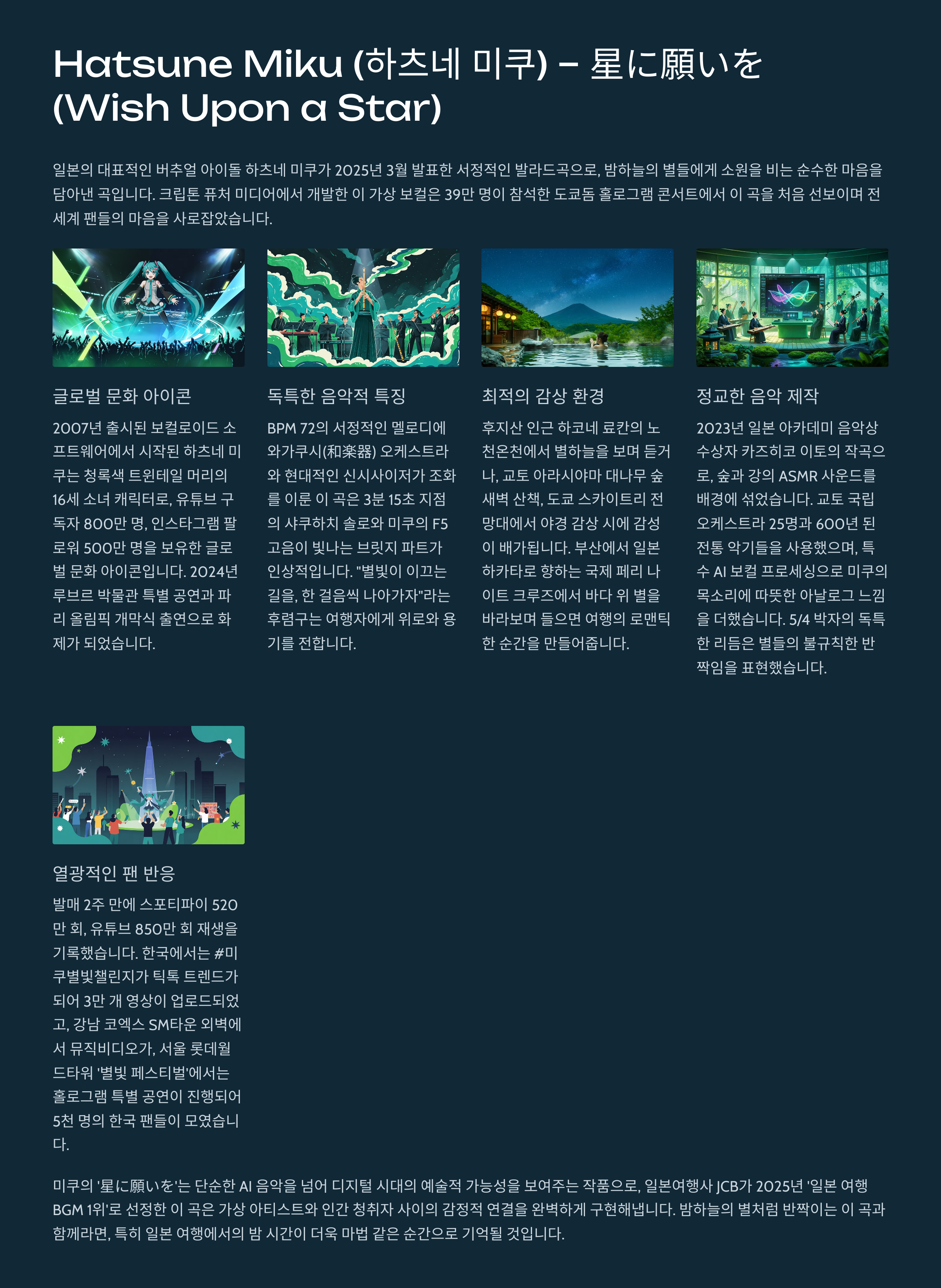 세계적으로 유명한 AI 보컬 Hatsune Miku는 2025년에도 감성적인 발라드로 우리의 마음을 움직입니다. “Wish Upon a Star”는 일본풍의 서정적인 멜로디에 따뜻한 메시지를 담은 곡으로, 밤하늘 아래 듣기 좋은 여행 BGM이에요.