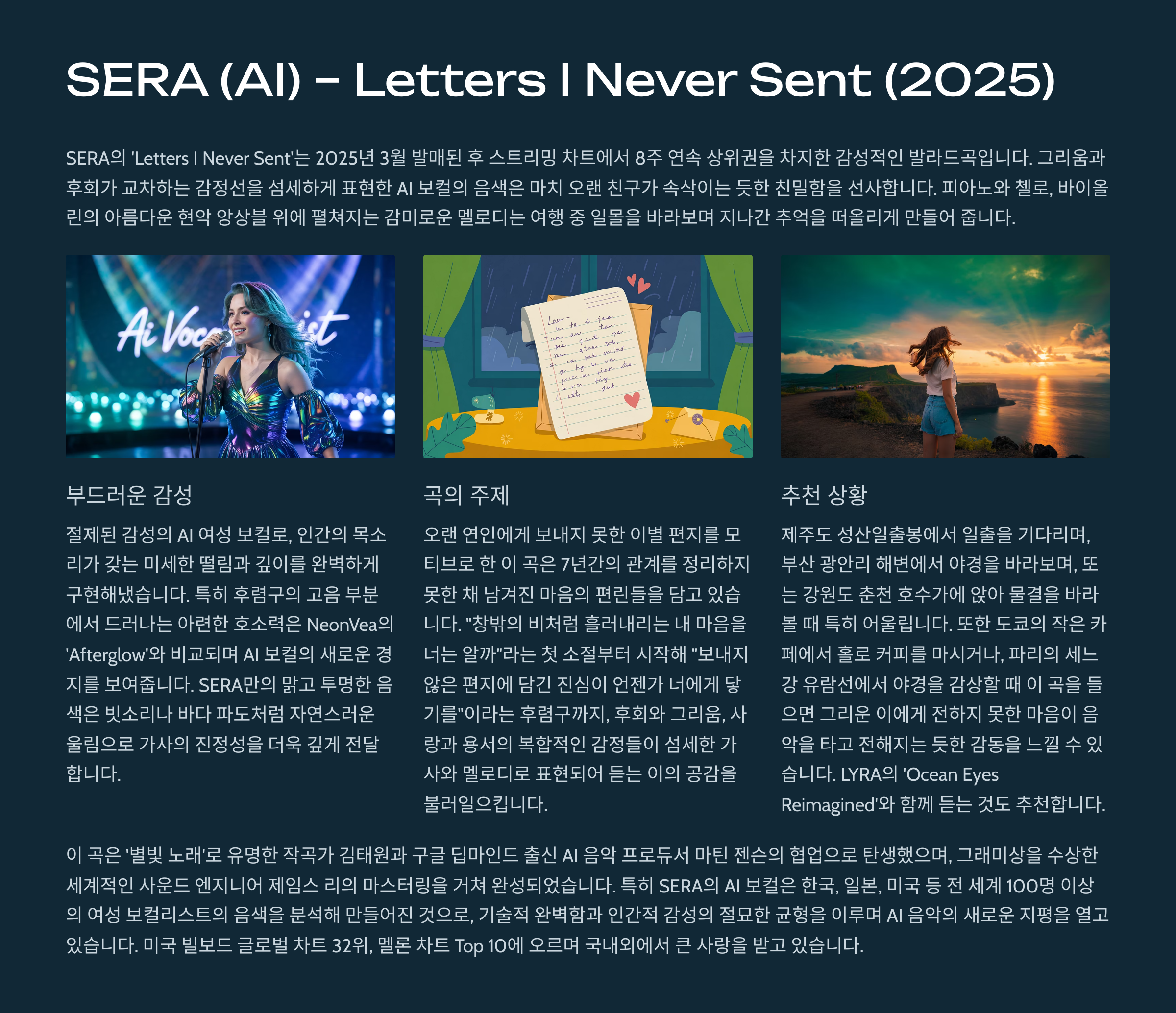 SERA는 부드럽고 절제된 감성의 AI 여성 보컬로, 고백하지 못한 진심을 음악으로 풀어냅니다.