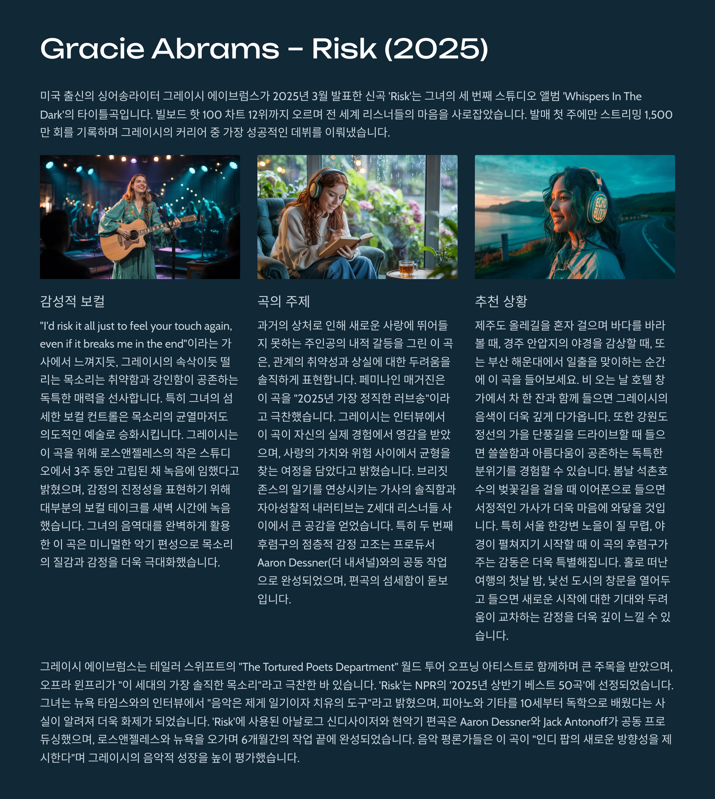 2025년 발표한 “Risk”는 사랑을 앞에 두고 망설이는 마음을 감성적으로 표현한 곡으로, 여행 중 문득 혼자만의 시간을 갖고 싶을 때 들으면 딱이에요.