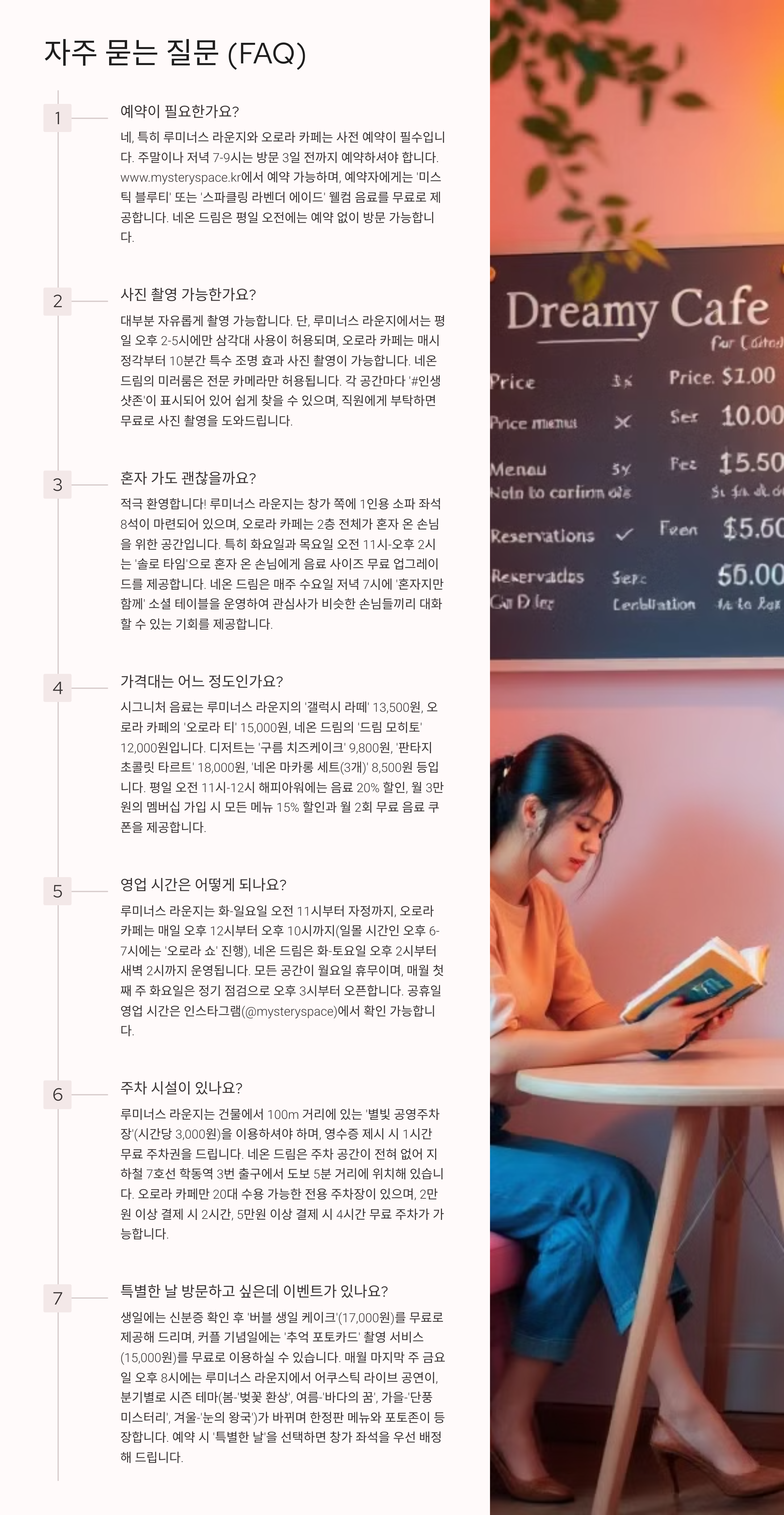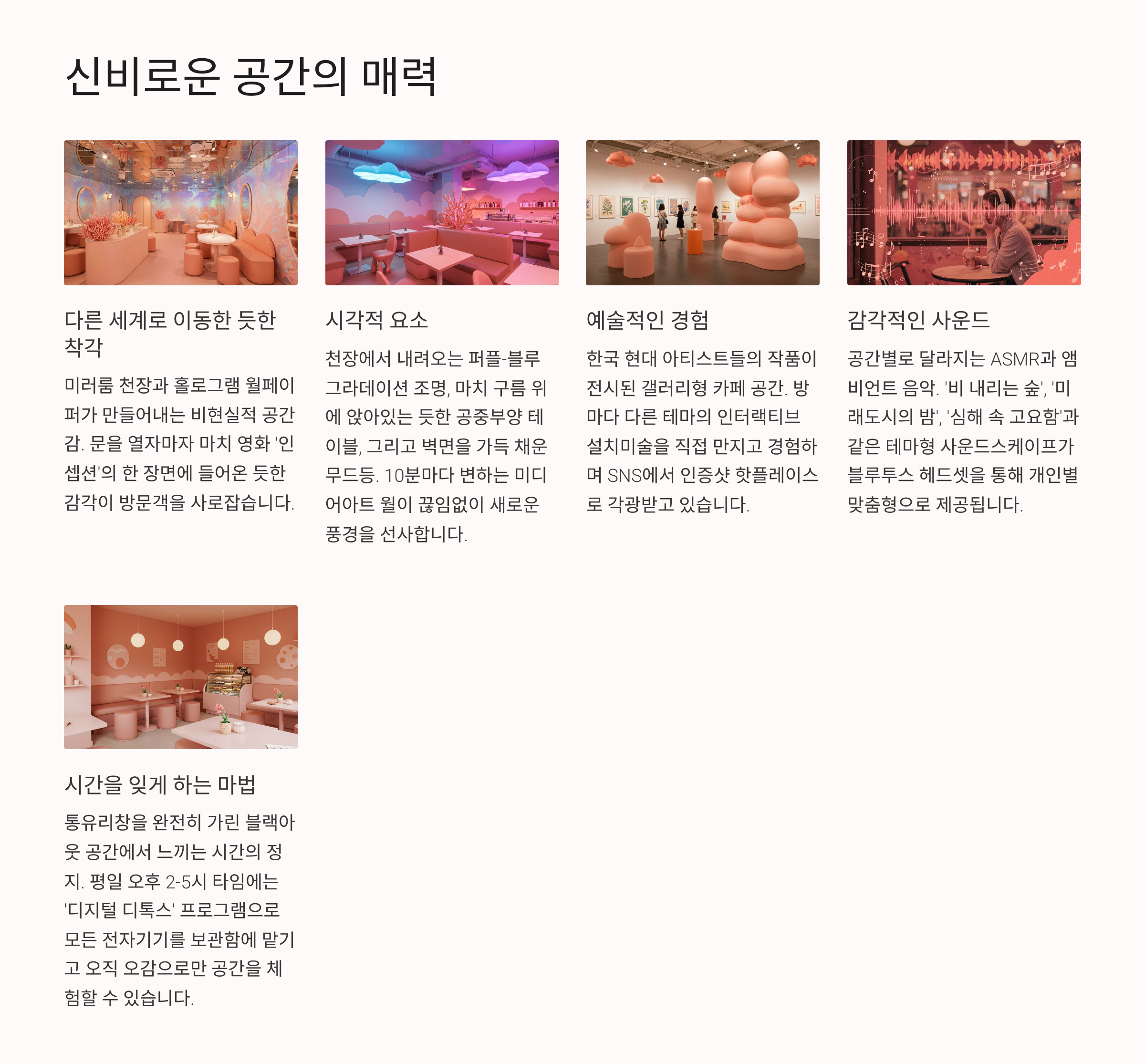 현실에서 잠시 벗어나 마치 다른 차원에 온 듯한 분위기를 만끽하고 싶다면, 오늘 소개해 드린 공간들을 꼭 방문해 보세요.