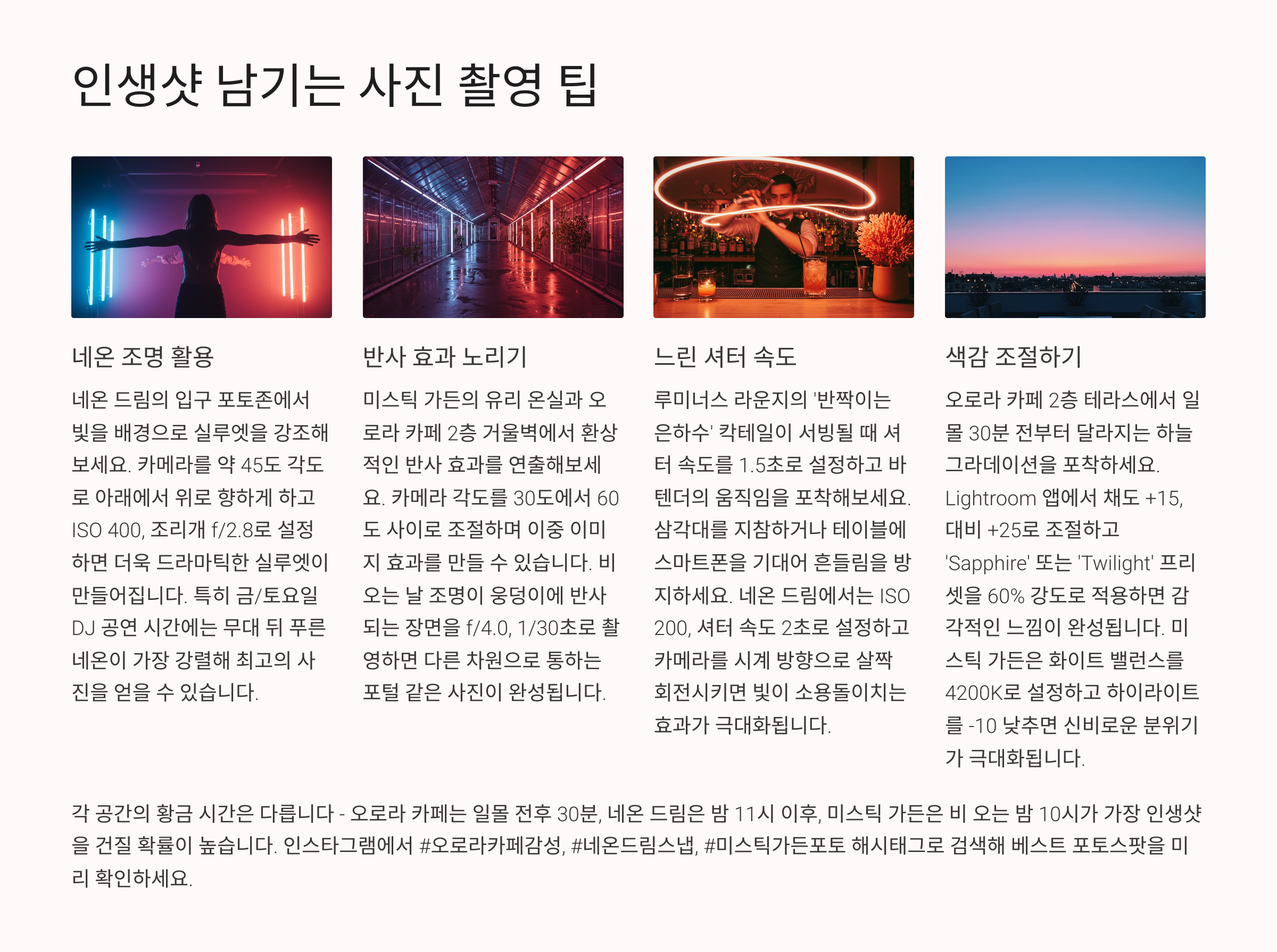 - 📸 네온 조명을 활용하라 – 빛을 배경으로 두고 실루엣을 강조하면 감성적인 사진이 완성됩니다.