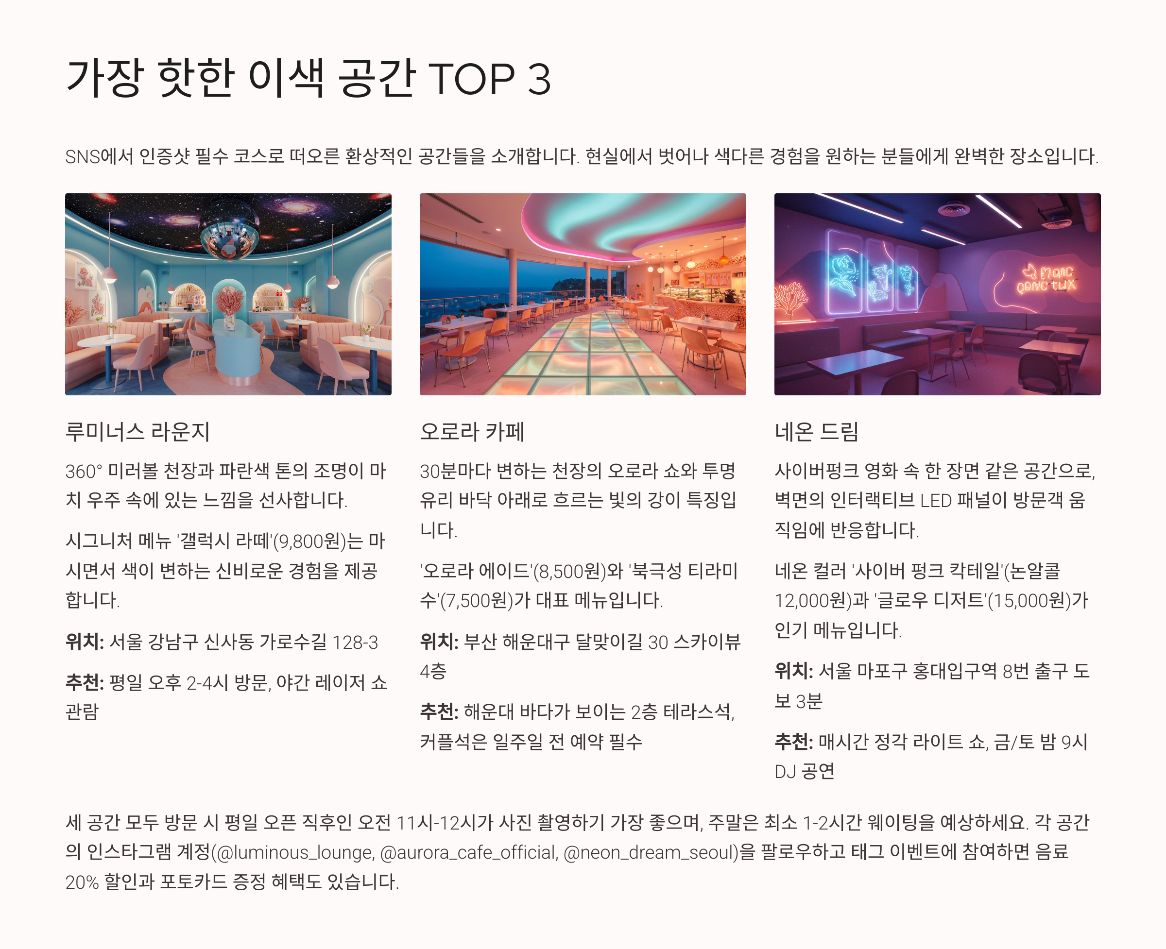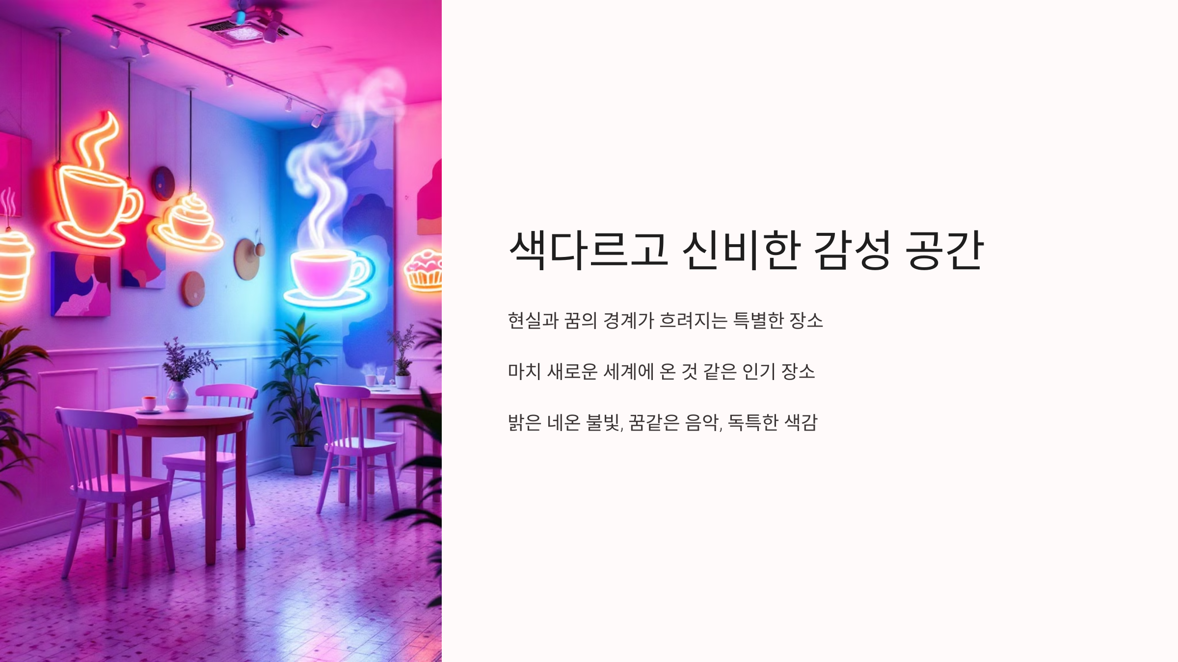 안녕하세요, 여러분! 일상에서 벗어나 새로운 감각을 깨우는 곳을 찾고 계신가요? 요즘 SNS에서 핫한 ‘비현실적인 감성’이 돋보이는 공간들이 인기를 끌고 있어요. 마치 영화 속 한 장면 같은 분위기를 연출하는 곳들인데요. 화려한 네온 조명, 몽환적인 음악, 오묘한 컬러감까지. 이런 곳에서의 경험은 단순한 카페나 라운지 방문을 넘어 하나의 특별한 기억으로 남아요. 오늘은 여러분께 그런 곳들을 소개해 드리려고 해요. 기대되시죠?