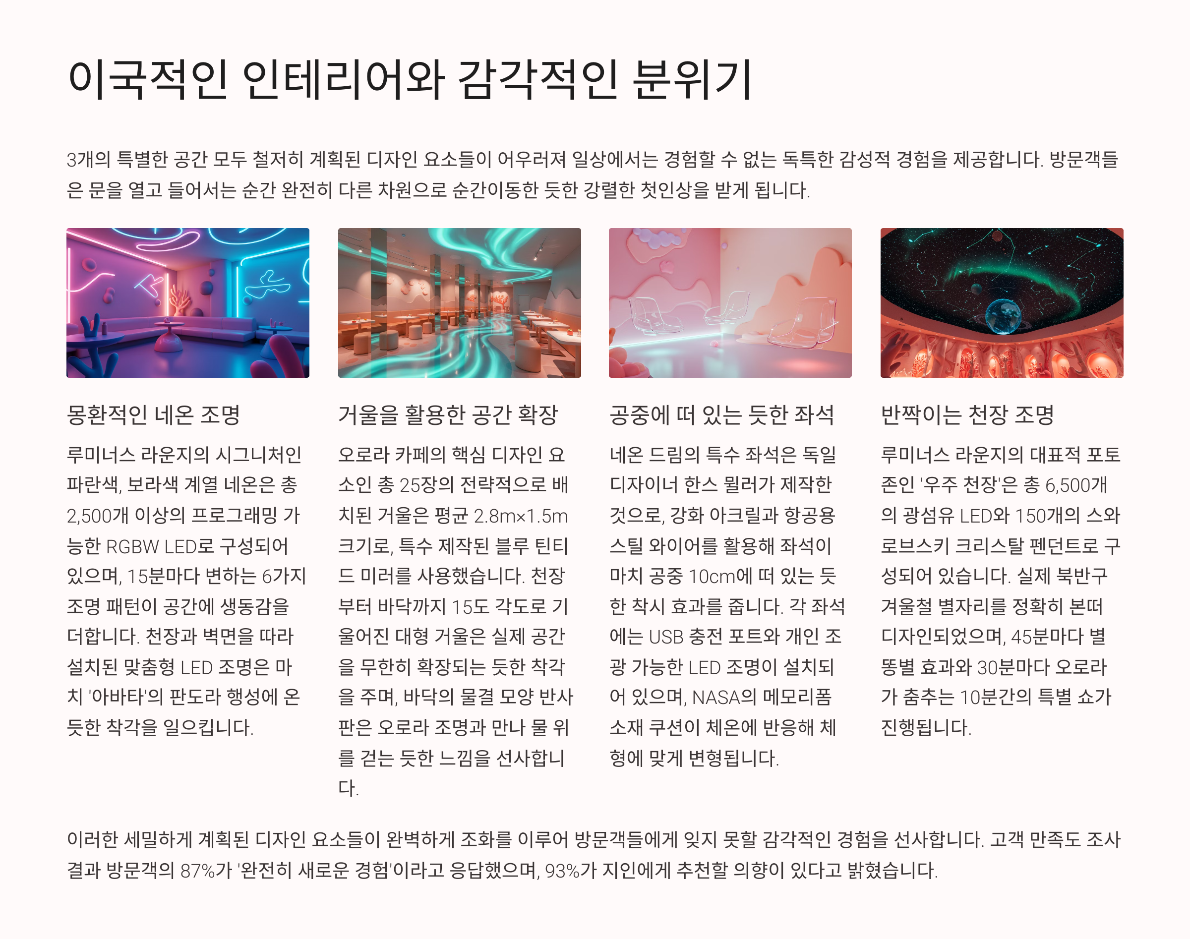 - 공중에 떠 있는 듯한 좌석 – 바닥이 보이지 않도록 디자인한 좌석 구조는 신비로운 느낌을 극대화합니다.
