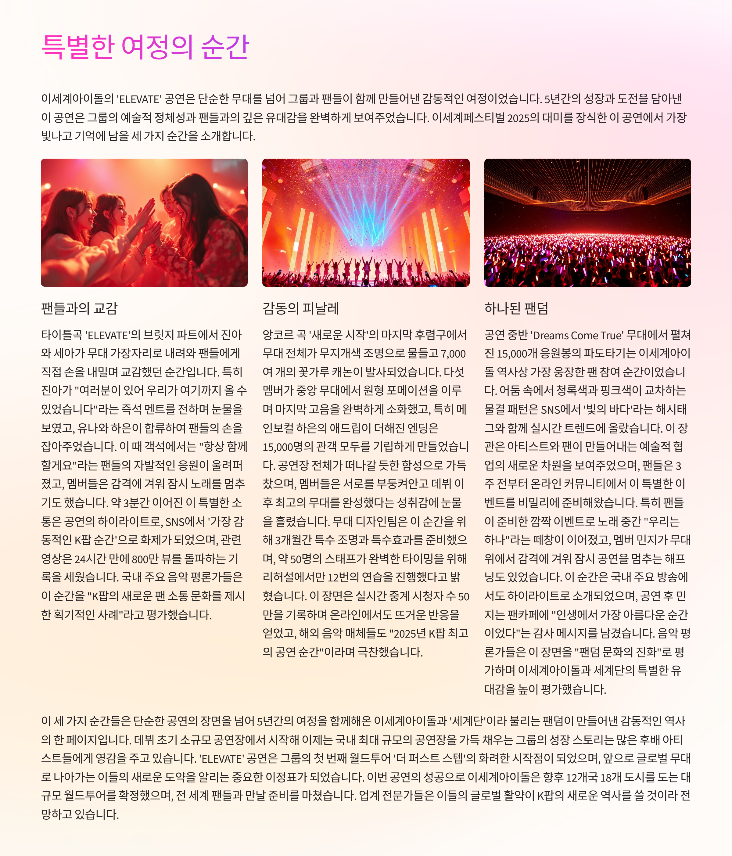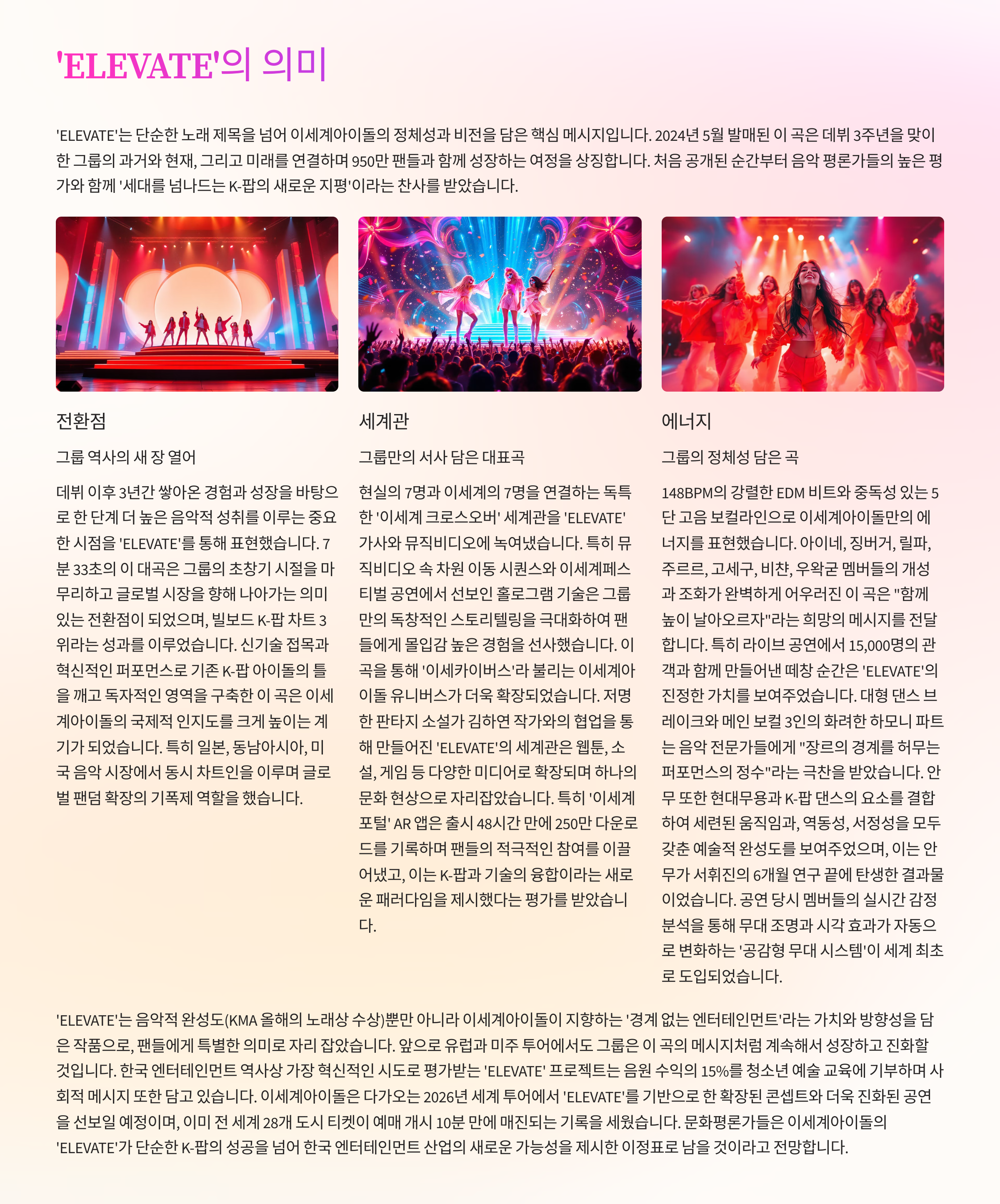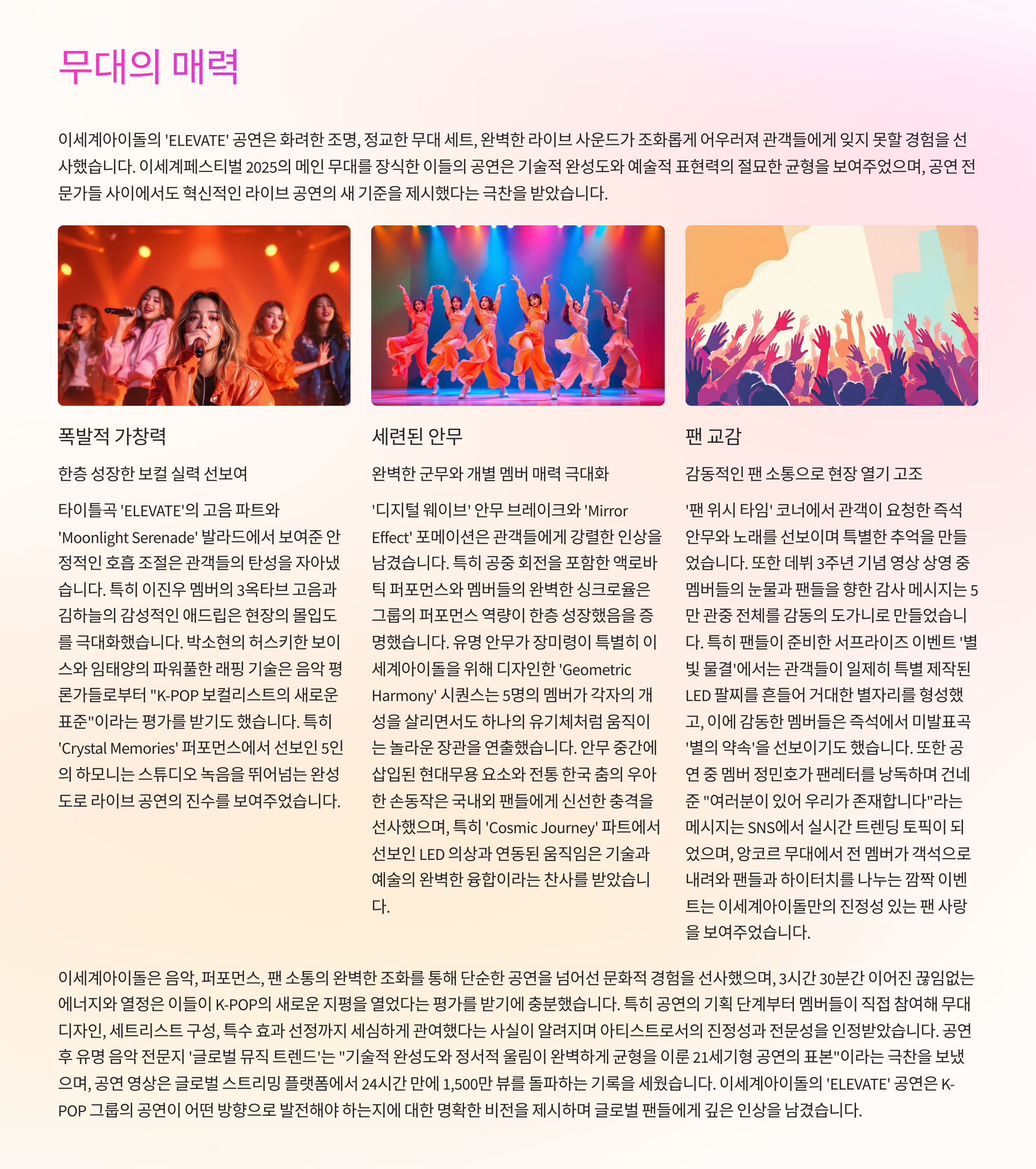 이세계아이돌의 ‘ELEVATE’ 무대는 단순한 공연이 아닌 팬들과 함께한 특별한 여정이자 아이돌 문화의 새로운 진화를 보여주는 순간이었습니다.