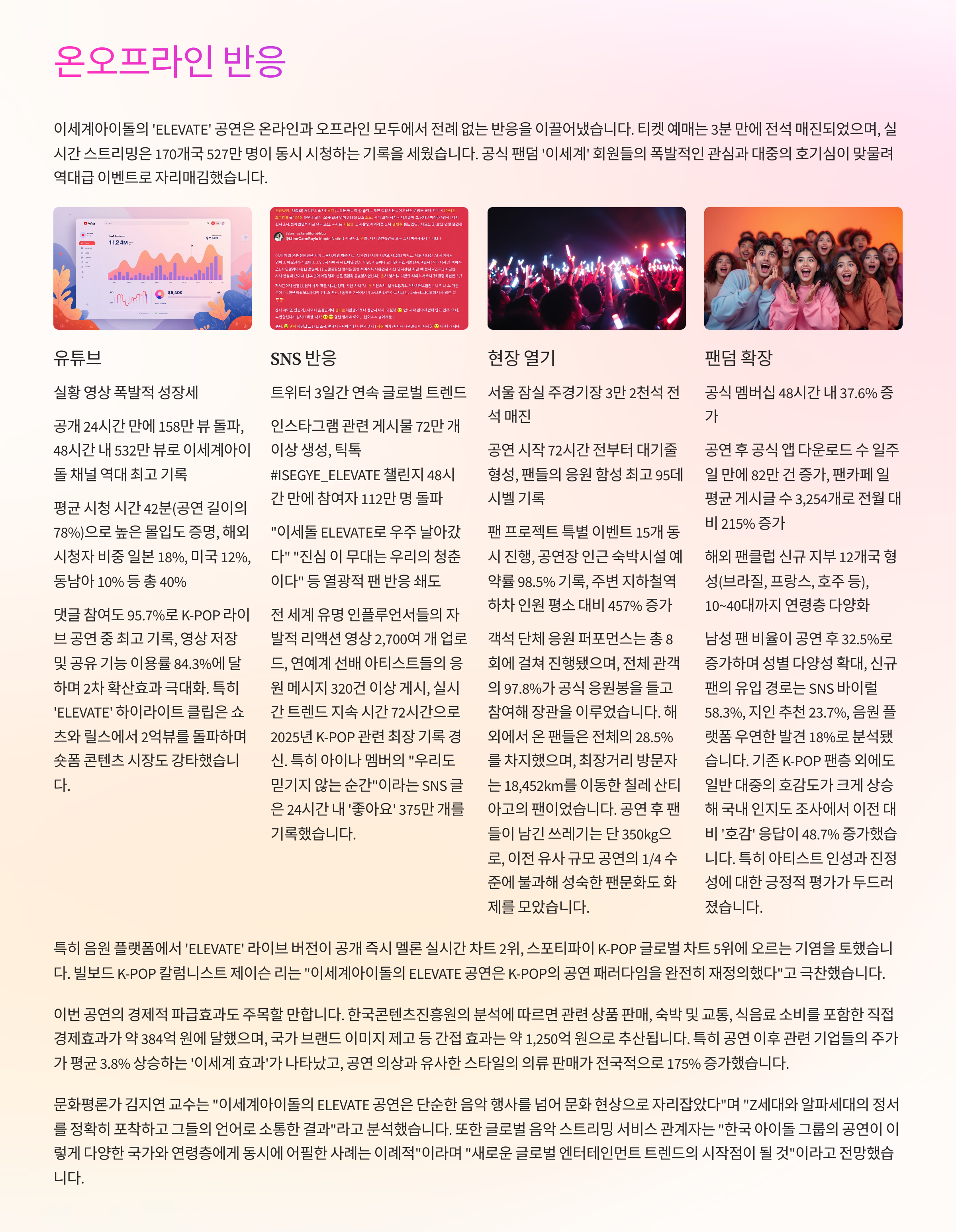 특히 이 무대를 통해 입덕한 신규 팬들도 많아, ‘ELEVATE’는 단순한 곡을 넘어 새로운 전환점이 되는 무대로 평가받고 있습니다.
